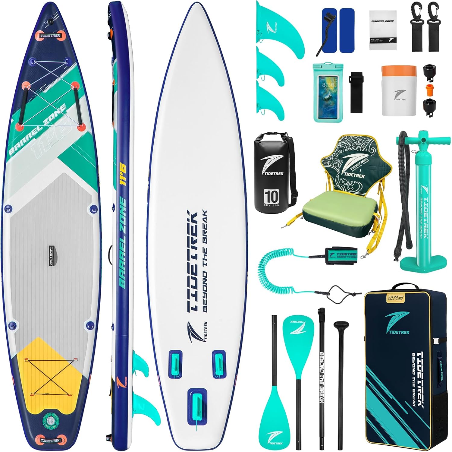 | Included Components | Carrying Bag, Main Product:1 Inflatable Paddle Board, Standard Accessories:1 Paddle Board Pack, 1 Adjustable Paddle, 2 Hook-And-Loop Paddle Straps, 3 Removable Fins, 1 Dual-Action High-Pressure Hand Pump, 1 SUP Ankel Coiled Leash, 1 Waterproof Phone Bag, 1 Repair Kit, 1 User Manual, Upgraded Accessories: 1 Compact Low-Pressure Electric Pump (battery not included; requires 6 AA batteries), 1 Inflatable Kayak Seat with Waterproof Fabric, 1 10L Waterproof Dry Bag, upgrades the paddle to a 4-piece dual-use paddle (SUP + kayak), Waterproof Phone Case |