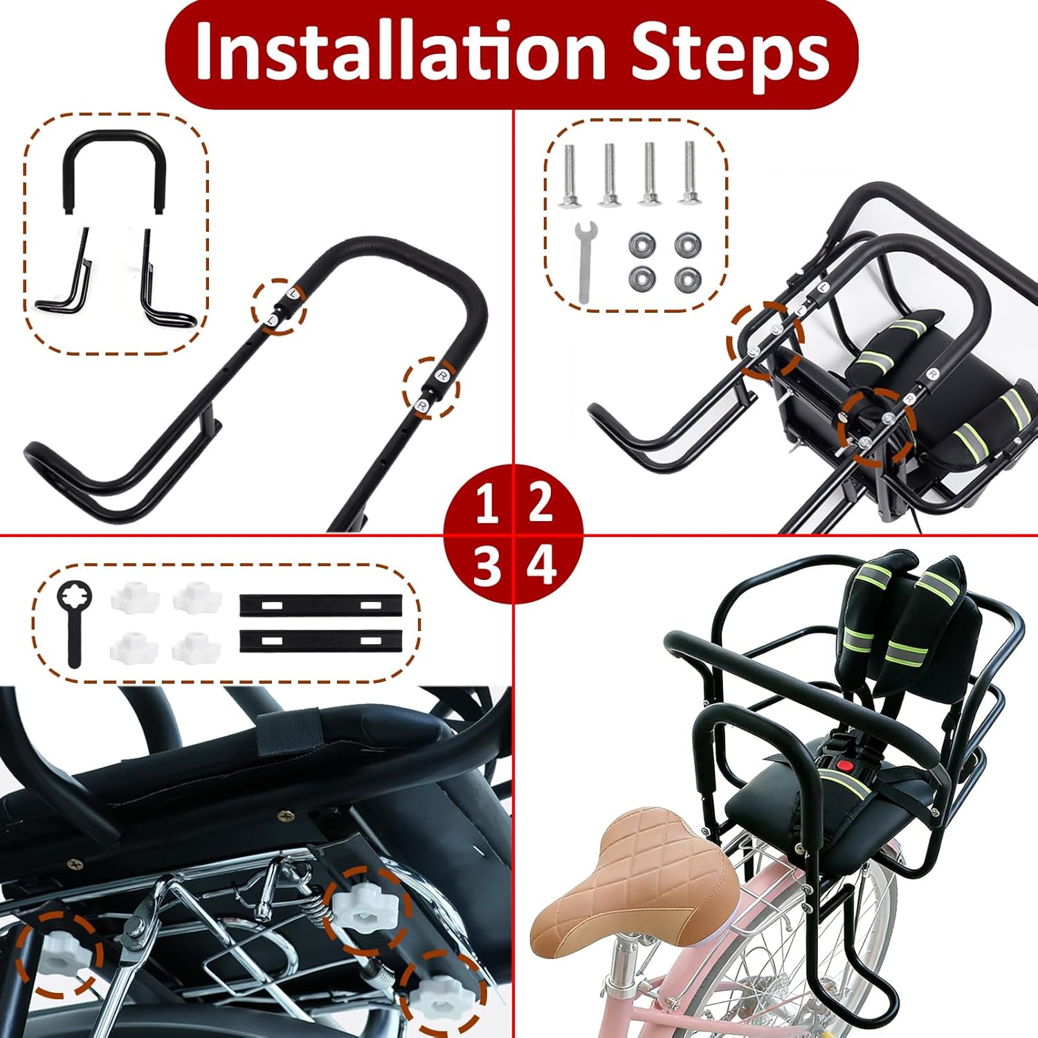 The rear-mounted baby bike seats have been upgraded with a foam safety belt to prevent sliding effectively. Round holes on the bottom of the rear handrail avoid finger pinching risks for kids, reflective tape on the back and seat belts enhances visibility during night rides. The child seat frame, handles, and pedals are made of thickened, hardened steel for outstanding durability and security.