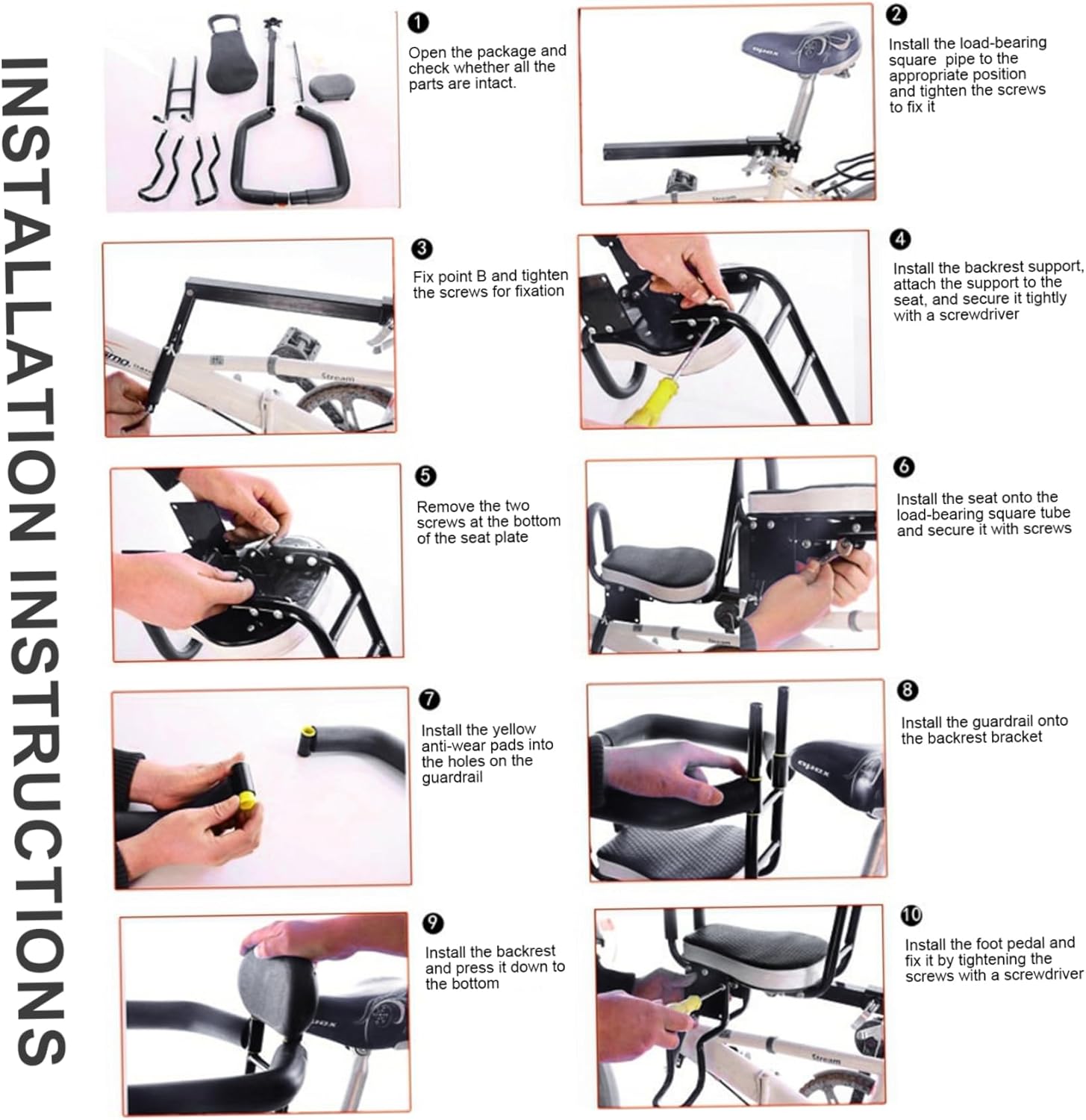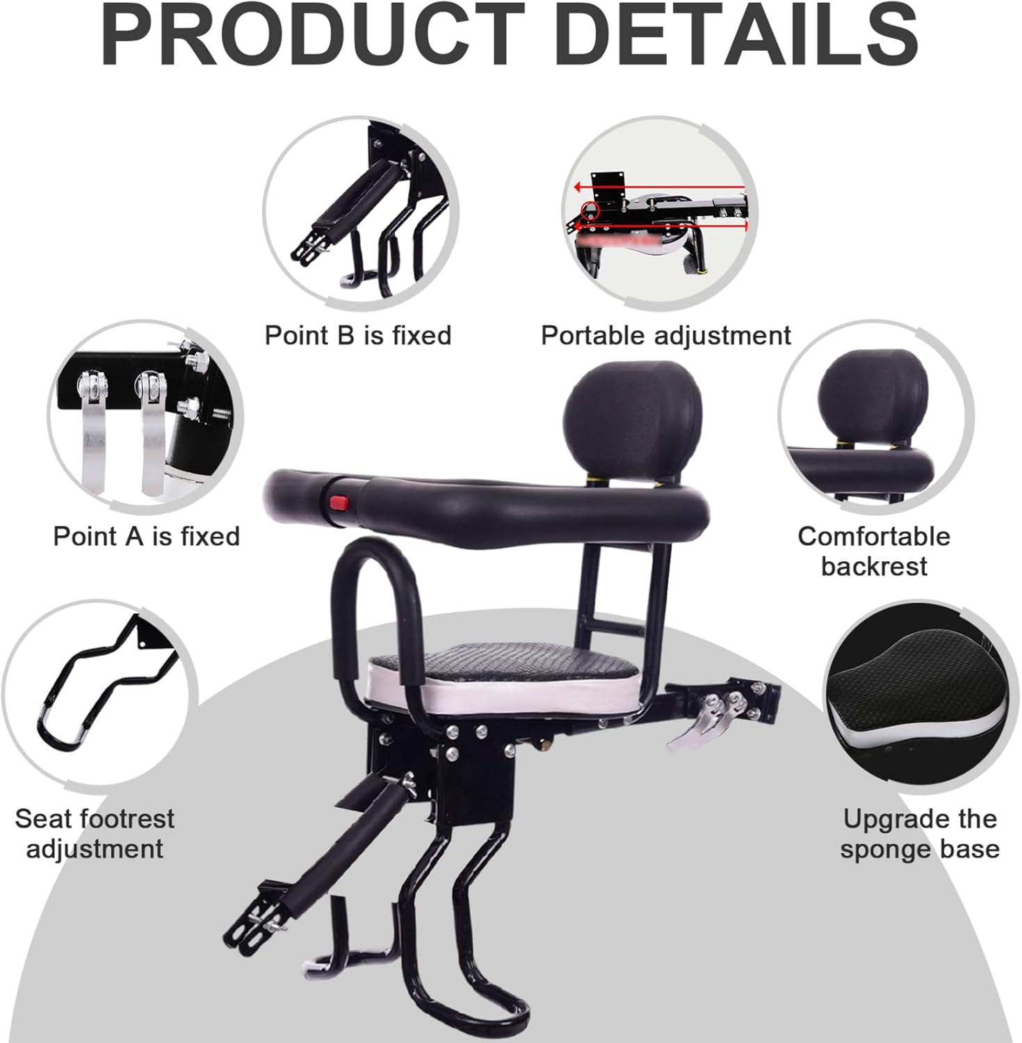 Bike Seat for Kids Front Mounted Toddler Bike Seat Easy to Install with Back Rest, Foot Pedal, Quick Realease Attachment for Children 2-5 Years, Style2 Description: Bike Seat for Kids Front Mounted Toddler Bike Seat Easy to Install with Back Rest, Foot Pedal, Quick Release Attachment for Children 2-5 Years offers a safe, comfortable, and convenient solution to carry your little ones aged 2 to 5 on your adult bike; its front-mounted design allows for direct interaction and better supervision, keeping your child within sight at all times, while the easy-to-use quick release attachment ensures rapid installation and removal; the seat features a comfortable backrest and secure foot pedals to maintain stability and support during rides, providing a cozy experience for your toddler; constructed with reliable materials, this child bike seat attachment withstands regular use and offers reliable safety; moreover, its versatile design fits most adult bicycles, making it an ideal choice for family outings and enhancing outdoor bonding moments between parents and children. Features:. Bike Seat for Kids. -Color: Black, White. -Material: Iron, Plastic. Note:Manual measurement, please allow slight errors on size.The colors may exist slight difference due to different screens. Package Including 1Pcs Bike Seat for Kids