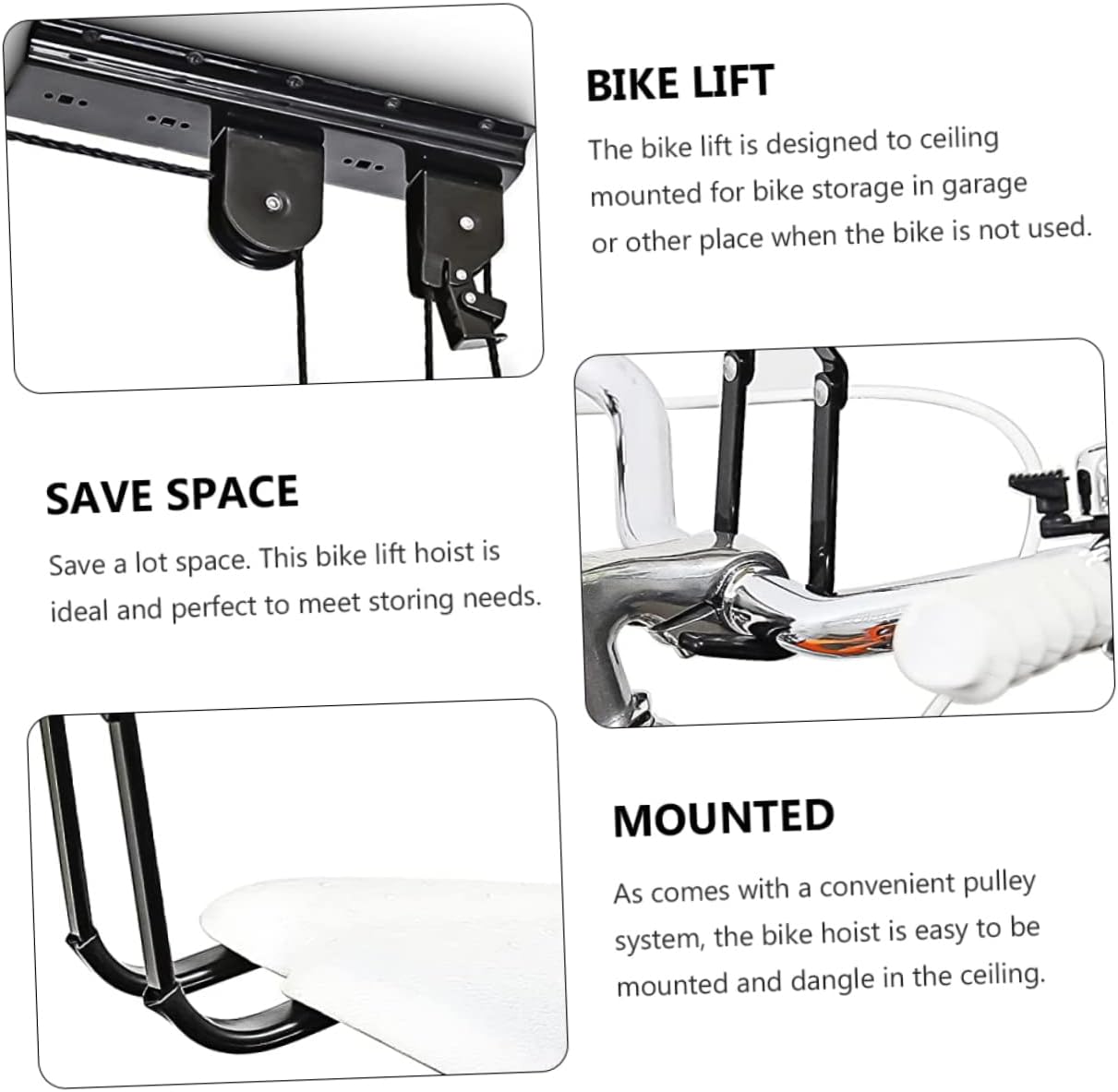 Package List 1 screws 1 screw covers 1 set x bike ceiling rack 1 x 15m ropeGoods DescriptionIndoor Bike Hoists When you’re , just unlock the rope, lower your bike and enjoy your riding.Hanging Rack 11x4.Bike Ceiling Mount 5cm / 10.Hanger - space.Bike Hoists - Size: 26x13x10.Wall Mounted Bike Hanger The exclusive rope locking mechanism prevents unwanted release and can suspend one bike.Indoor Bike Storage Rack Features - Color: Black.Bike Hanger - As comes with a convenient pulley system, the bike hoist is easy to be mounted and dangle in the ceiling.Bike Wall Hook 22x5.Rack - The bike ceiling hoist uses locking mechanism to lock the bike in place and prevent the bike accidental release and falling down.Bike Ceiling Rack - Just attach the hooks to bike, , smooth pulleys and latches make lifting even heavy bikes easily.Bike Wall Stand Holder - Material: Steel.Ceiling Hook - The is designed to ceiling mounted for bike storage in garage or other place when the bike is not used. This hoist is and perfect to meet storing needs. The bike hoist uses a rope and pulley system that is mounted to your ceiling. 13inch. Smooth pulleys and latches make lifting even heavy bikes super easy
