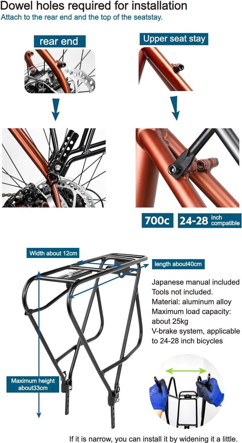 ・[Product contents]: Rear carrier [Cargo platform size]: Length 40 x width 12 cm, maximum height 33 cm[Material]: Aluminum alloy [Maximum load capacity]: Approx. 25kg[V brake system, applicable to 24-28 inch bicycles] ・[Aluminum Material] This rear carrier is made of anodized aluminum, which is high quality, lightweight, and has excellent corrosion resistance.It also has excellent corrosion resistance and does not easily rust.Furthermore, the carrier surface is coated with anodized (alumite) coating, making it more resistant to rust and more durable.Finished with a smooth surface. It's safe even on rainy days. ・[Smart Design] Only one piece is attached to the seat stay for a neat look.The overall look is neat and slender, giving you a smart look. ・[Super load capacity] Maximum load capacity is approximately 25kg! Can load heavy loads.Ideal for commuting by bicycle or commuting to school by bicycle. No need to worry even if your luggage increases while touring. ・[Compatible with 24-28 inches] Suitable for most bicycle types such as 24-28 inches, cross bikes, mountain bikes, folding bikes, etc.It can be adjusted up and down and back and forth, allowing you to flexibly attach it to the size that suits your bike. Secure with one dowel hole on the seatstay and two dowel holes on the rear end. ・[Easy to install] Comes with Japanese instructions and is easy to install.Please check the dowel holes required for installation before purchasing. Please prepare tools as they are not included.