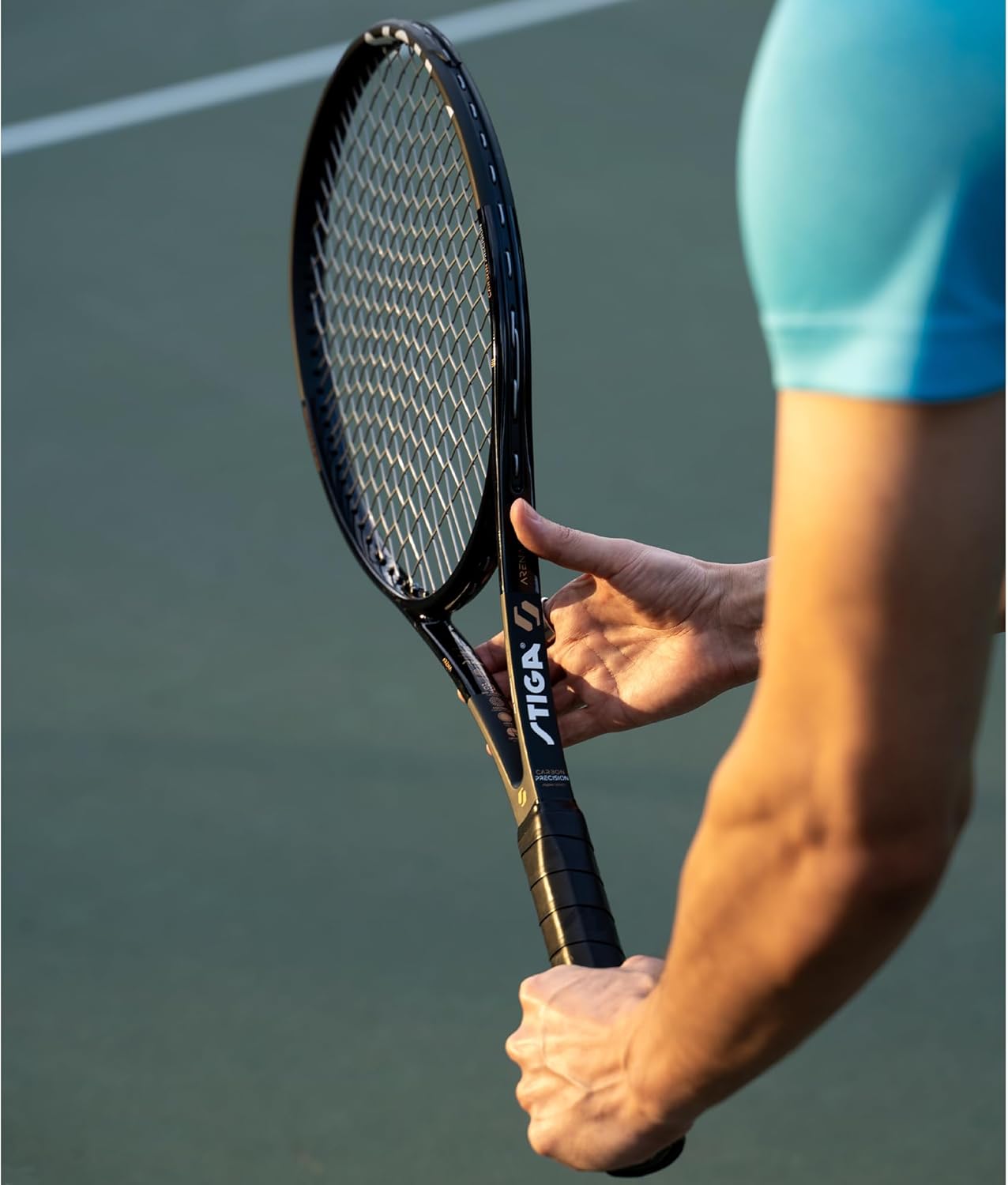Is your current racket not stable enough to impact? Would you like to gain stability while keeping good feelings? The Stiga Arena tennis racket is for you. This model is made for advanced players who master the technique and do not need help with speed, but who are looking for a reliable control racket for even more precision. The Stiga Arena is ideal for those who like to play aggressively in the background with explosive flat shots or lots of topspin. Thanks to its shock-resistant carbon fibre frame with a thickness of 21 mm, its 15 cm2 head and 18 x 20 string plan, you have in your hands a high-precision racket whose sweet spot offers more control. The neck is reinforced by VibraTech, which absorbs vibrations to give you a softer feel in power transfer and allow you to play for hours without unnecessarily straining your elbows and hands. The improved vibration damping also contributes to even greater stability.