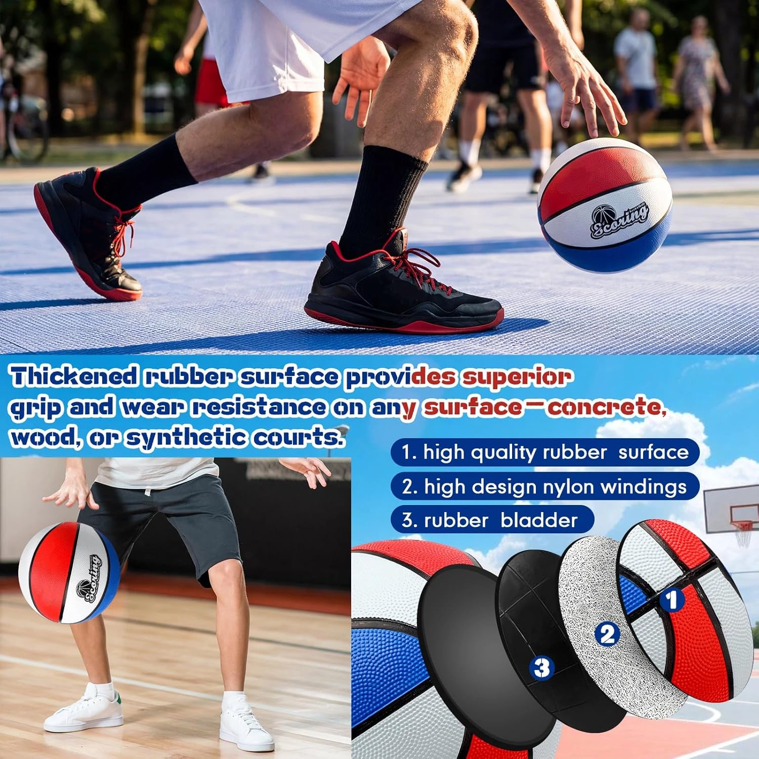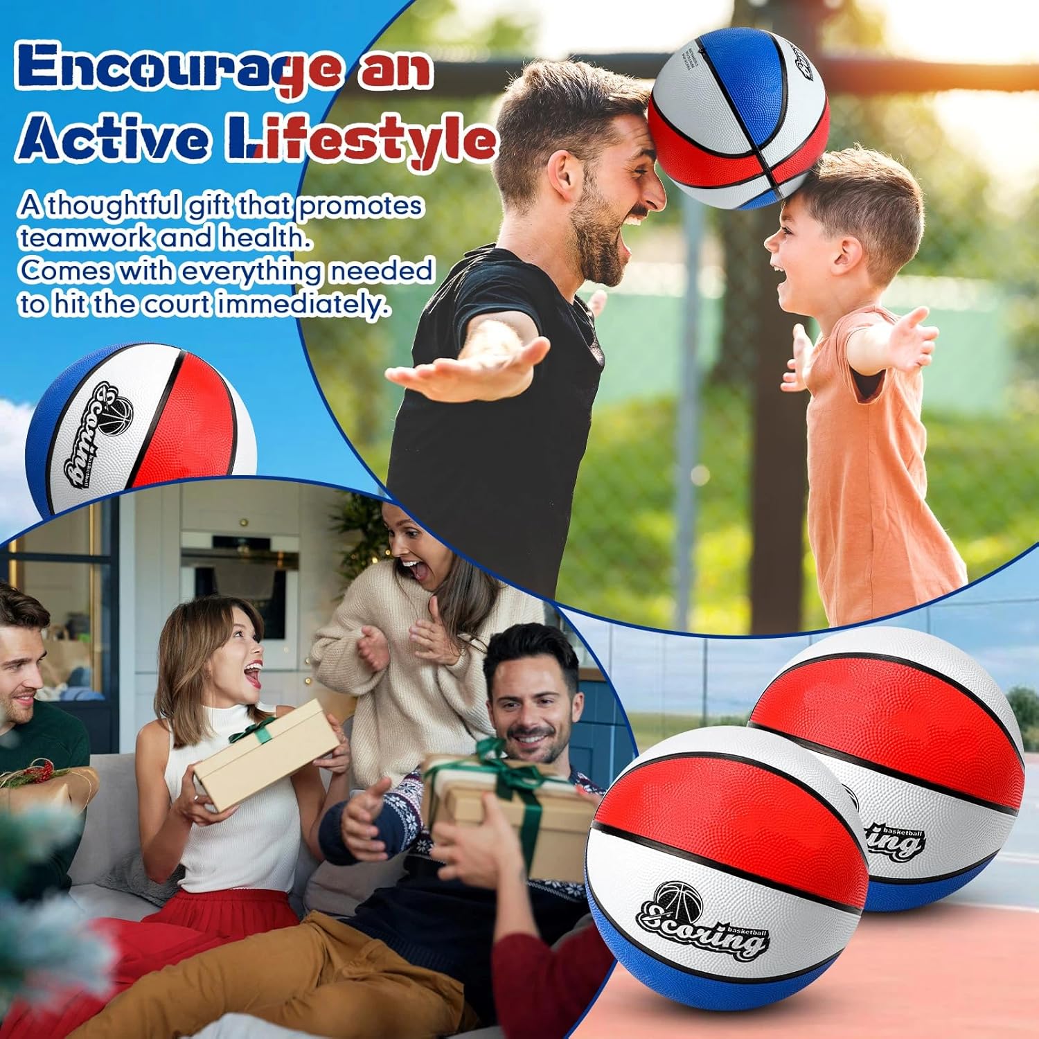Features: Proper Size for Kids: The 27.5-inch size basketball is specifically designed for younger players, making it easier for them to handle and improve their skills. This size is recommended for children aged 5-13, promoting confidence in their game. Sport Gifts: These basketballs make an excellent gift for birthdays, holidays, or any special occasion. Encourage an active lifestyle and a love for sports in kids with this fun and practical gift. Specifications: Material: rubber Color: red, blue, white Size: size 5(about 27.5 inch) Package includes: 6 x Basketballs 6 x Air pump 6 x Storage bags Notes: Manual measurement, please allow slight errors on size. The color may exist a slight difference due to different screen displays.