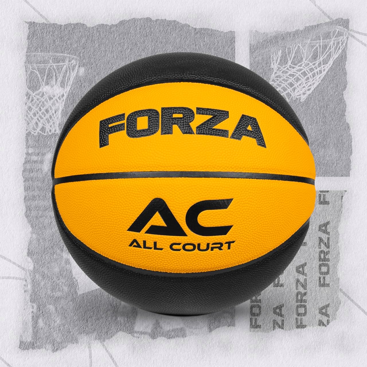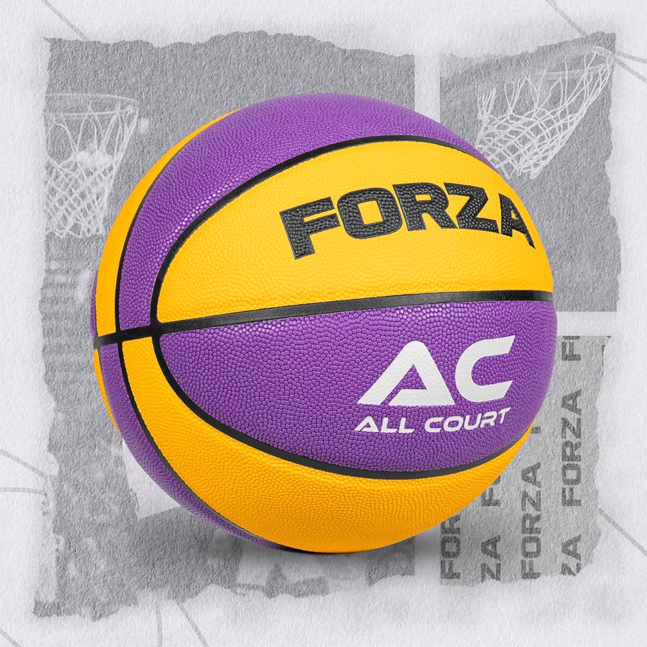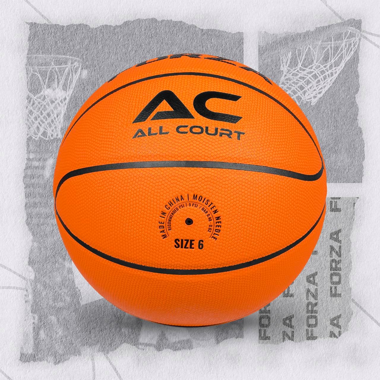 FORZA All Court Pro Basketball SpecificationsDimensions:Size 3: 22in | 56cmSize 5: 27.5in | 69.5cmSize 6: 28.5in | 72cmSize 7: 29.5in | 75cmWeight:Size 5: 10.5oz | 298gSize 5: 16oz-18oz | 450g-510gSize 6: 18oz-20oz | 510g-560gSize 7: 20oz-22oz | 560g-620gMaterials:Casing: Durable high-quality PVC leather with a thin foam layer for a soft feelTraditional pebbled finishButyl bladder with a double-threaded nylon winding for excellent air retention & ball shapeRubber outer bladder for a consistent & reliable bounceMiscellaneous:Smooth 6mm wide channels for maximum finger grip & controlSize 3: Mini Basketball, all agesSize 5: Ages 9 and underSize 6: Official size & Weight of Women’s League Basketball & Youth League (Ages 9-12)Size 7: Official size & Weight of Men’s League Basketball (Ages 13+)Colors:Orange, Purple/Yellow, Teal/Black, Two Tone Purple, Tri Tone Blue & Black/YellowAvailable Packs:Pack of 1x, 5x, or 24x basketballsNote: Requires inflation before use.
