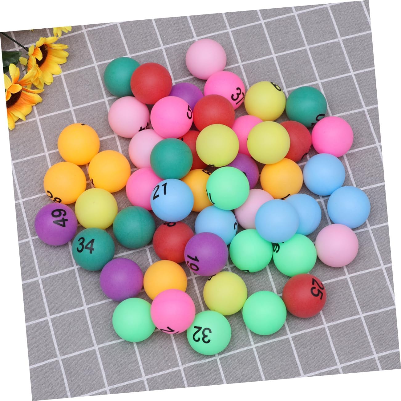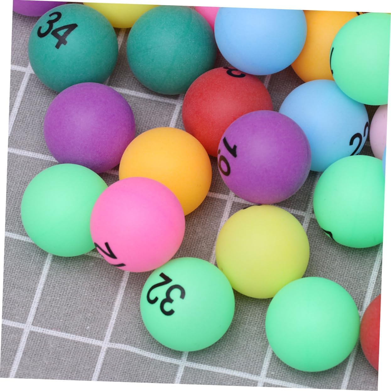 Package Include 100 x Numbered Balls Characteristics - Size: 4 x 4 x 4cm Numbered Pong Balls. - Color: As shown Numbered Table Tennis Balls. - Material: PE. - Good for raffles and drawings during celebrations, events, and game Pong Balls. - Printed with number, easy to recognize Table Tennis Balls. - The bright colors make them easy to find and these are durable, no easy fading Printed Pong Balls. - A Little bounce. Not suitable for ping-pong practice or tournament.Goods DescriptionMulticoloured Balls The pack of 50 assorted color PP tennis comes with balls( -50).Tennis Balls with Numbers Great for balls, arts, entertainment game draw, table tennis club propaganda balls, , , decoration balls, party balls etc