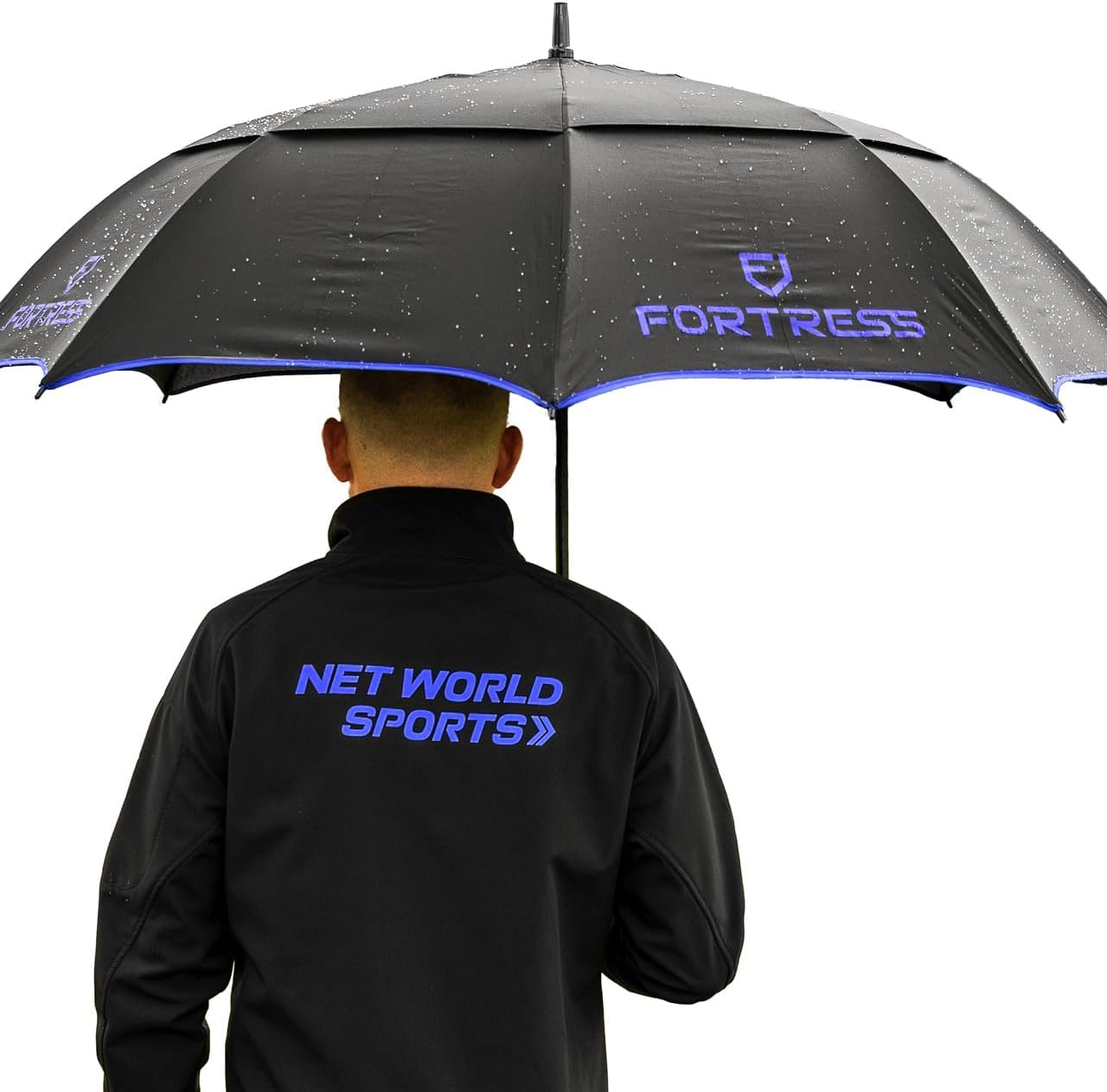 "AVAILABLE STYLES: Net World Sports Football Umbrella: Light blue canopy with white Net World Sports branding & trim FORZA Football Umbrella: Black canopy with yellow FORZA branding & trim FORZA Football Umbrella: Yellow canopy with black FORZA branding & trim FORB Golf Umbrella: Black canopy with green FORB branding & trim Vermont Tennis Umbrella: Black canopy with white Vermont branding & trim FORTRESS Cricket Umbrella: Black canopy with purple FORTRESS branding & trimDIMENSIONS: Diameter: 60in│150cm Height: 40in│ 100cm Handle Length: 6in │ 14cm Weight: 700g | 1.5lbMATERIALS: Premium quality 190t pongee fabric canopy Lightweight fibreglass frame with eight ribs Comfortable EVA foam handleMISCELLANEOUS: Double canopy construction creates a vent for the wind to pass through the umbrella Features a locking button located on the handle for quick & easy opening Perfect for various sports or casual recreational use Each umbrella comes supplied with an ultra-durable storage sheath Available individually or in packs of 5"