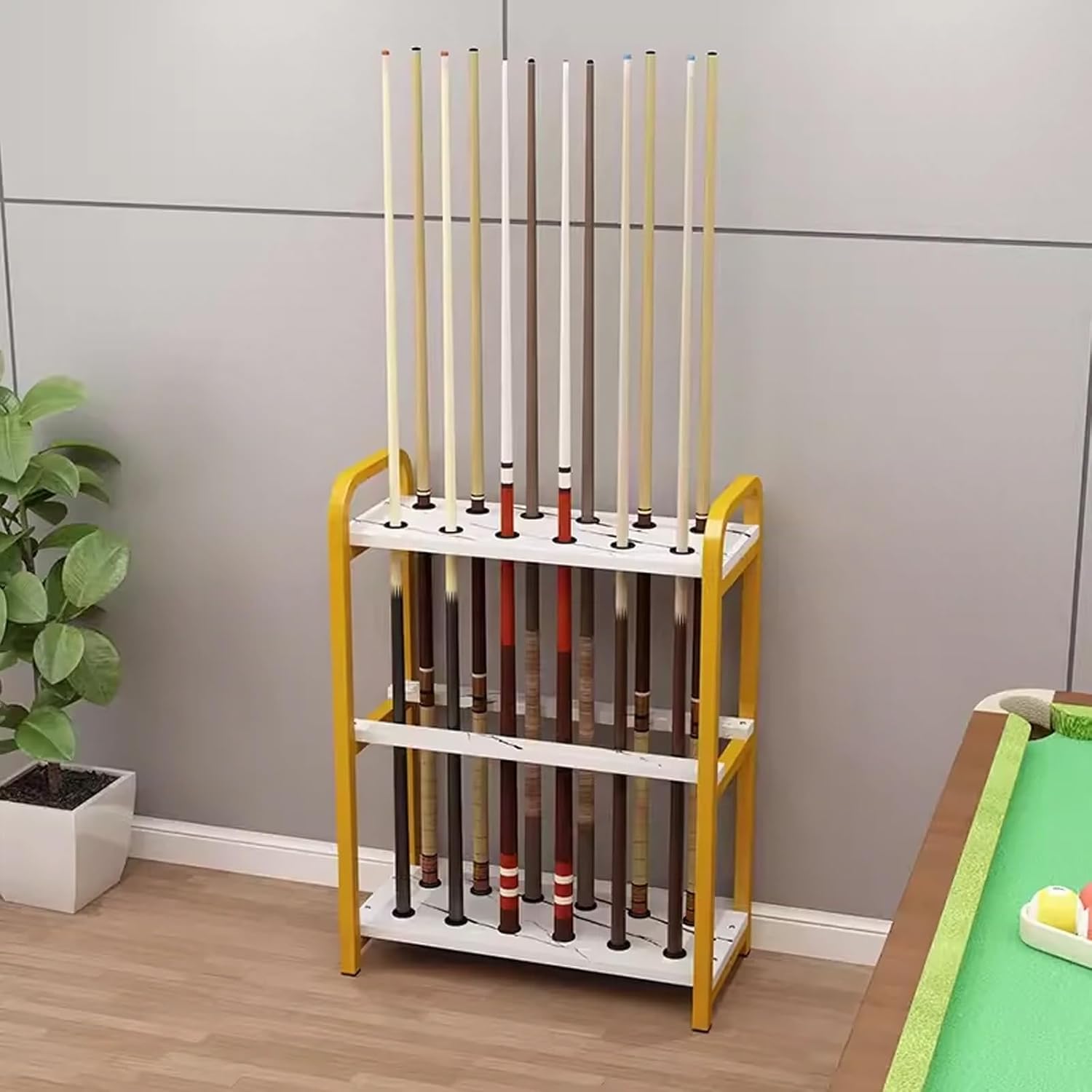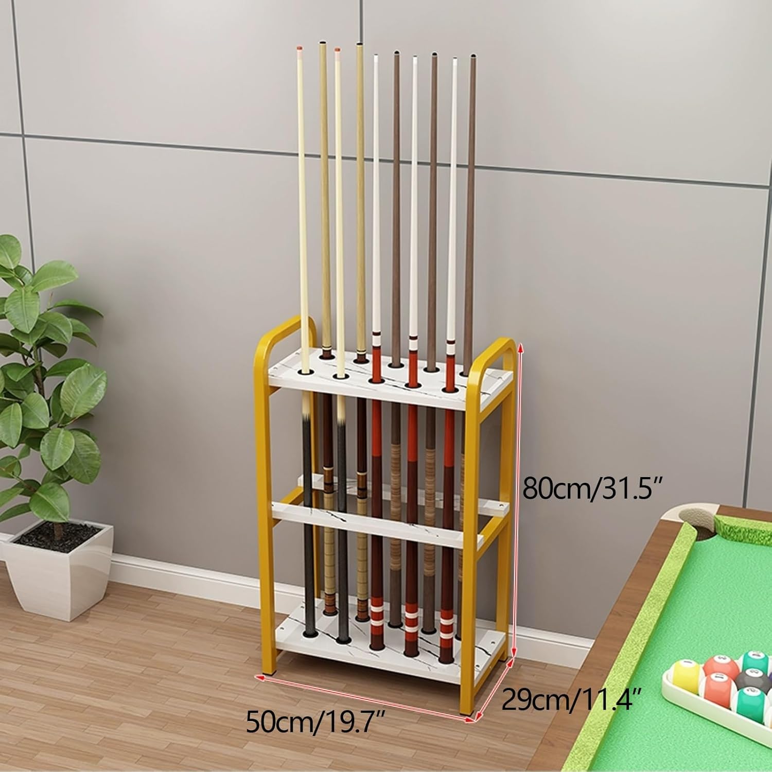 Introducing our Portable Tabletop Pool Cue Holder, the perfect accessory for any pool enthusiast looking to enhance their game room's organization and elegance. This pool table accessory is designed for convenience and functionality, making it an essential addition to your gaming setup. **Effortless Organization** Our pool cue rack offers a stylish solution to store your cue sticks and other pool table accessories, ensuring everything is in its place. With its thoughtful design, you can easily keep your game area tidy, allowing for more enjoyable playtime with friends and family. **User-Friendly Transport** Equipped with elevated handles on both sides, this cue holder is not only easy to lift but also prevents accidental spills of your equipment. Whether you're moving it around your game room or transporting it to a friend's house, this feature makes it hassle-free. **Protect Your Investment** We've incorporated premium rubber circle pads that not only safeguard your valuable cue sticks from damage but also enhance the stability of the holder. This protective feature ensures that your equipment remains in top condition, allowing you to play with confidence. **Durable Craftsmanship** Crafted from high-quality wood and iron art, our cue holder combines durability with an aesthetically pleasing design. The natural wood finish adds a warm touch to your decor while ensuring excellent bearing capacity for long-lasting use. **Versatile Options** Choose from a variety of sizes to suit your specific needs. Our pool stick holder is available in three specifications: - 15.7"W x 11.4"D x 31.5"H - 19.7"W x 11.4"D x 31.5"H - 23.6"W x 11.4"D x 31.5"H Elevate your game room's functionality and style with our Portable Tabletop Pool Cue Holder. It's more than just an accessory; it's a valuable investment in your leisure time.