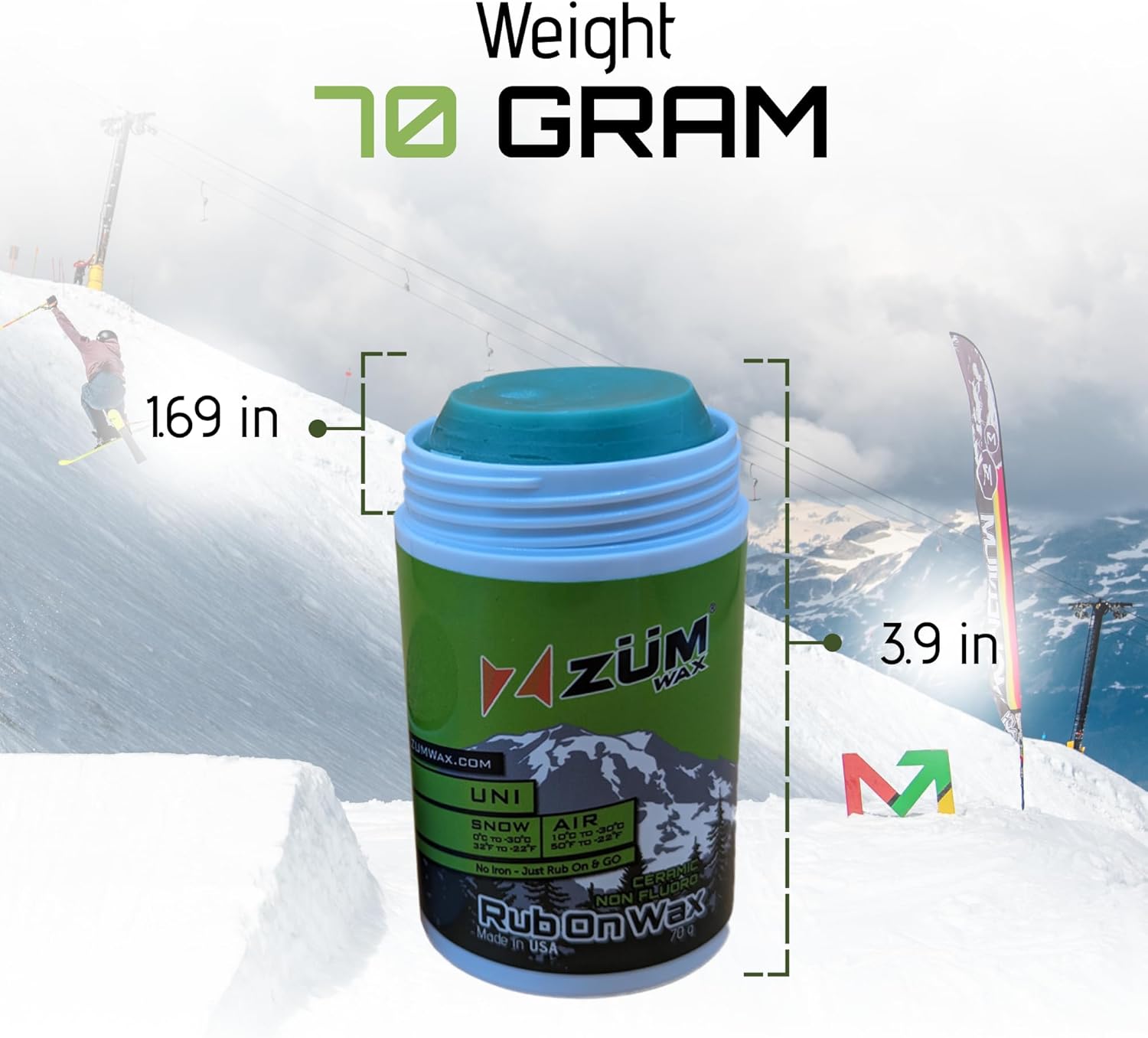 Experience effortless ski and snowboard waxing with our ZUMWax Rub-On Ceramic Wax. This 70g, all-conditions wax is designed for quick and easy application, thanks to its convenient cork applicator. It's perfect for Ski, Snowboard, Nordic, and Cross-Country equipment, providing long-lasting performance and a pleasant vanilla scent. PFAS-free and made in the USA, this wax effectively removes dirt, water spots, and oxidation, ensuring your gear stays protected and performing at its best.