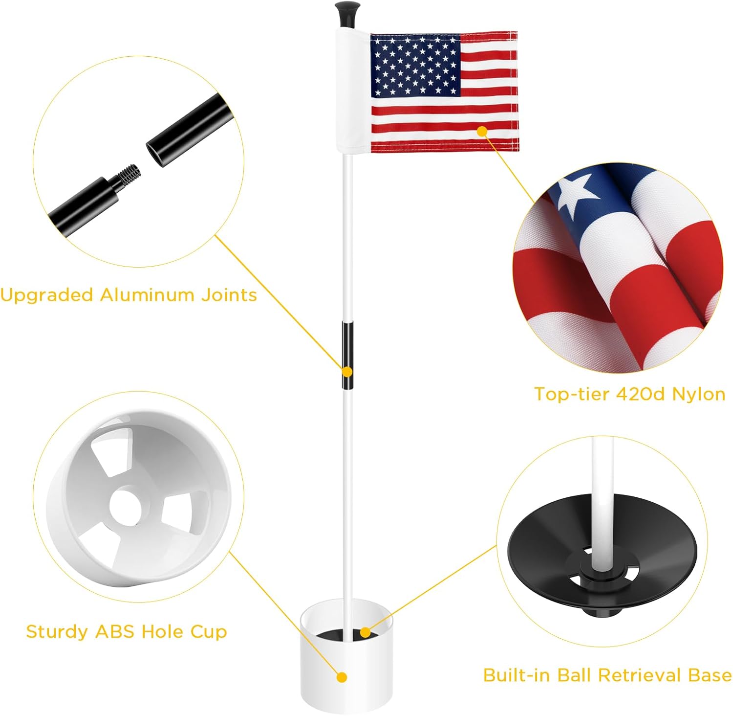 Turn any outdoor space into a personal golf course with the KINGTOP Portable Golf Hole Digger & Flagstick Set! Designed for golf enthusiasts who love DIY practice greens, this bundle combines precision hole digging with a professional-quality flagstick to create the ultimate backyard golf experience. The carbon steel blade hole digger, featuring blackened, heat-treated durability, makes it effortless to dig PGA/USGA standard holes. With pre-marked depth indicators, you can accurately create 4-inch or 6-inch holes. The detachable wooden handle ensures comfortable grip, easy storage, and portability, making it perfect for home practice greens, garden golf, and even outdoor tournaments. The 2-piece golf flagstick is designed for easy assembly and transport, featuring a painted finish and a ball-retrieving base, so you'll never have to bend down to pick up your ball again. The high-visibility 6"x8" nylon flag is made from engineering-grade 420D fabric, ensuring bright, fade-resistant colors for long-lasting outdoor use. The ABS golf hole cup, crafted to R&A/USGA standards, includes three drainage holes to keep it dry and clean in any weather. Perfect for backyards, gardens, golf parties, and travel, the KINGTOP Portable Golf Hole Digger & Flagstick Set allows you to create your own mini golf course anytime, anywhere. Whether practicing alone or enjoying golf with friends and family, this set brings the game to you!