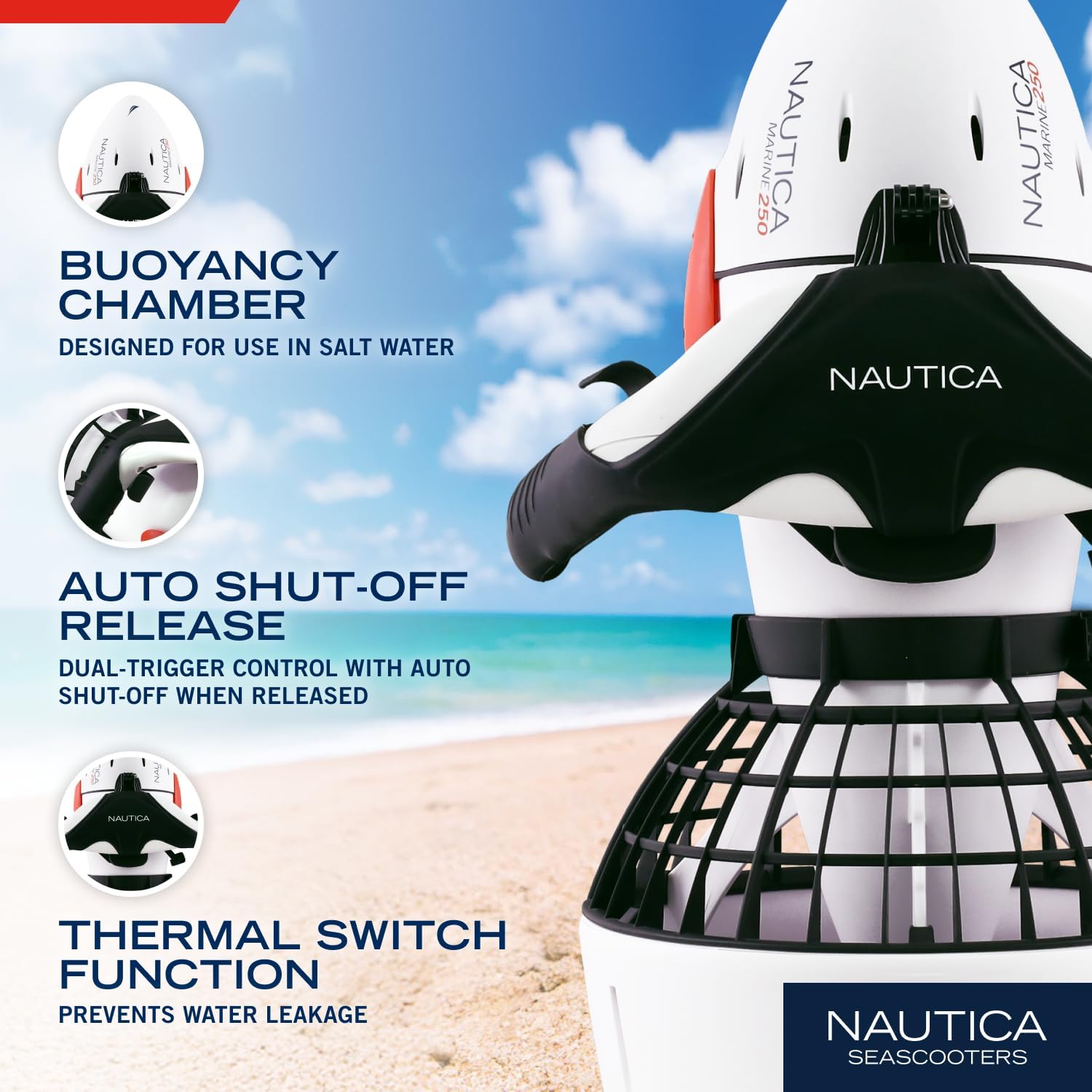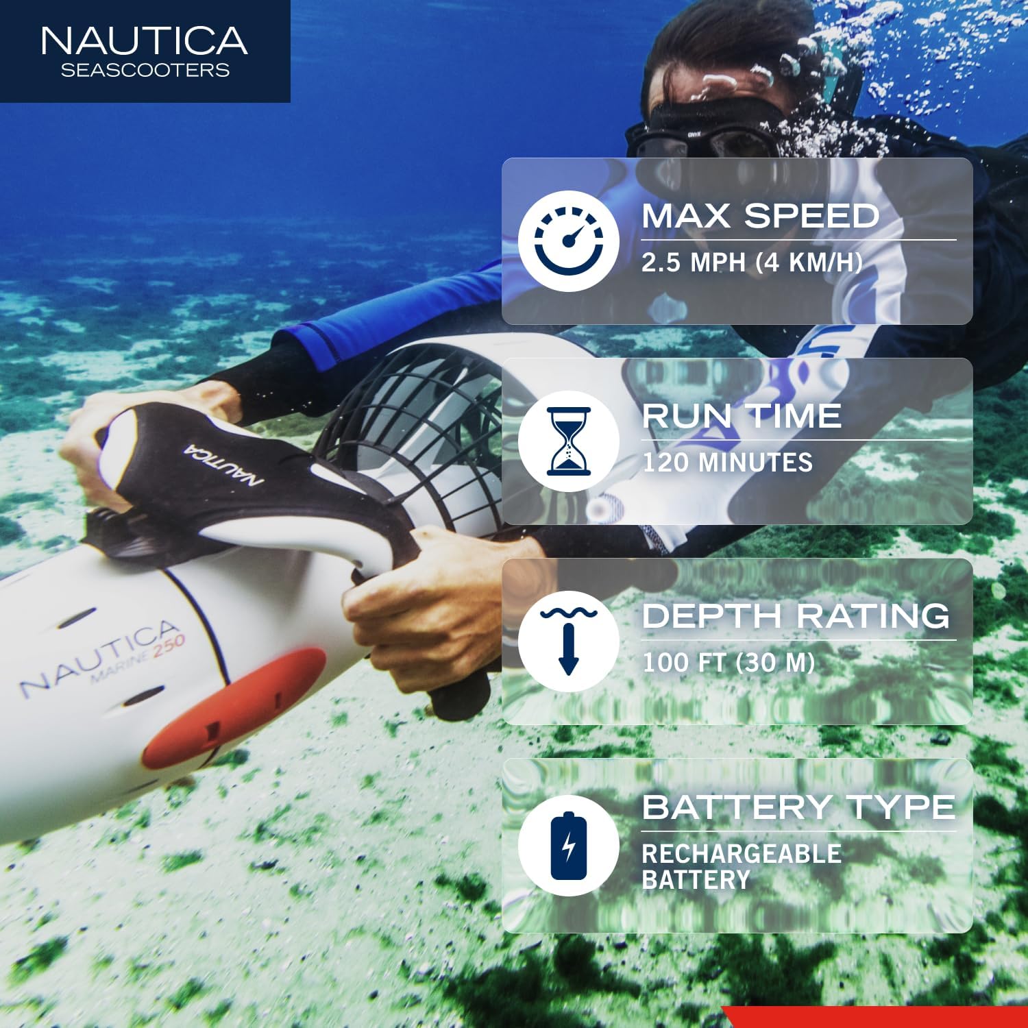 The Nautica Marine 250 Seascooter offers the perfect balance of power, weight and run time for all day family fun in the ocean, lake or pool. At only 18lbs. this water scooter delivers high thrust with up to 2 hours of run time. Features include Ergonomic design for effortless underwater propulsion, adjustable buoyancy module to customize your dive profile, underwater action camera mount, exclusive Marine sea scooter battery and a scuba depth rating down to 100' feet. Whether snorkeling, scuba diving or just having fun in the swimming pool, this underwater scooter is designed for your next adventure.