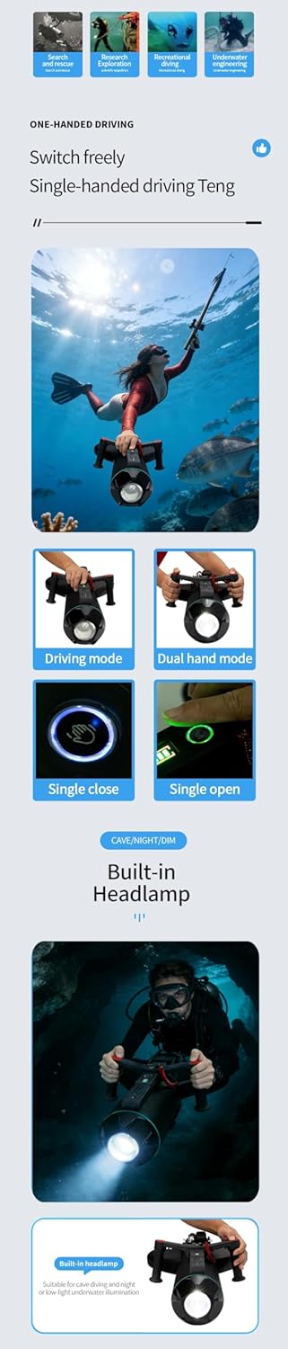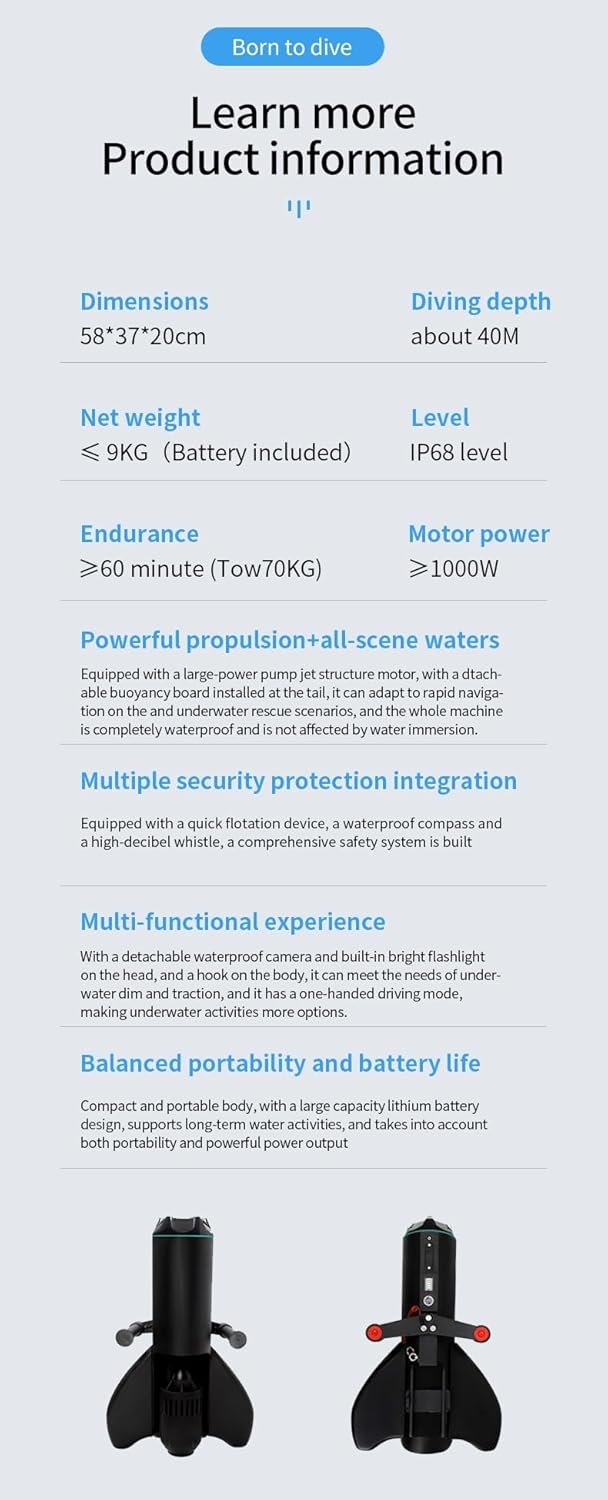| Included Components | Underwater Scooter, Lithium Battery, Detachable Waterproof Camera Mount, Built-in Headlamp, Waterproof Compass, High-decibel Whistle, Quick Flotation Device, Buoyancy Board, User Manual |