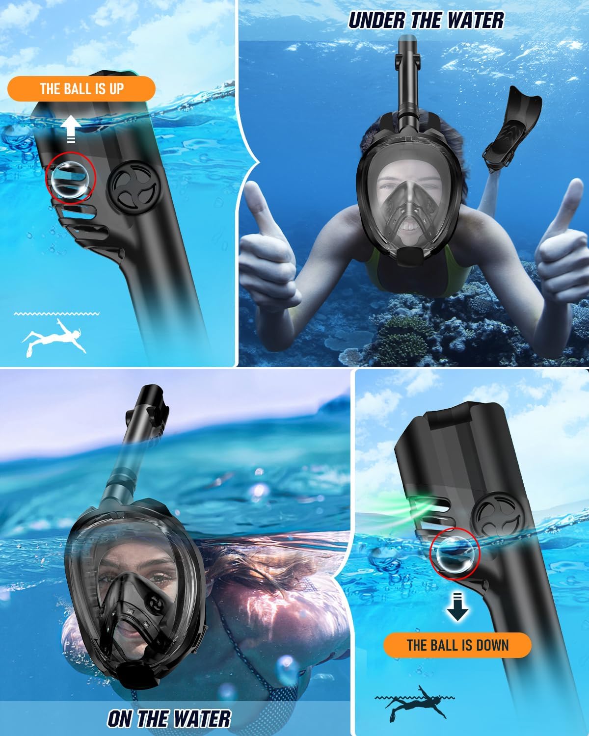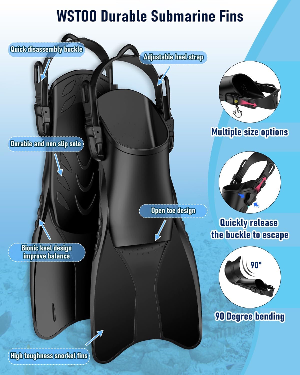 WSTOO Fins Snorkel Set For Adults & Kids &Teenagers1.180-Degree panoramic HD view:WSTOO snorkel mask adopts transparent flat lens made by high definition premium PC, preventing blurred vision without causing dizziness and Shatterproof.With the removable motion camera mount allows you to clearly discover the underwater world.2.The latest dry top snorkel system:WSTOO full face snorkel mask has the outstanding performance in breathing and air intake.The mask and breathing system are divided into two parts.3.Foldable and portable:WSTOO snorkeling mask can be folded for easy portability, For people who usually train and travel, it saves space.When removing the diving mask, there is a silicone strap connecting the mask and snorkel to prevent loss.4.90 Degree flexible and adjustable diving fins:Easy donning and doffing.The snorkeling fin has an adjustable buckle to adjust the size, suitable for adults and teenagers, children.5.Comfortable to wear:The open-toe design of the snorkeling fin can drain water, the keel design on both sides maintains balance, and the non-slip design.Strong thrust reduces resistance in water and soft silicone.Package Includes:Snorkeling Fins x1Snorkel Mask x1Dry Top Snorkel x1Snorkel Gear Bag x1User Manual x1