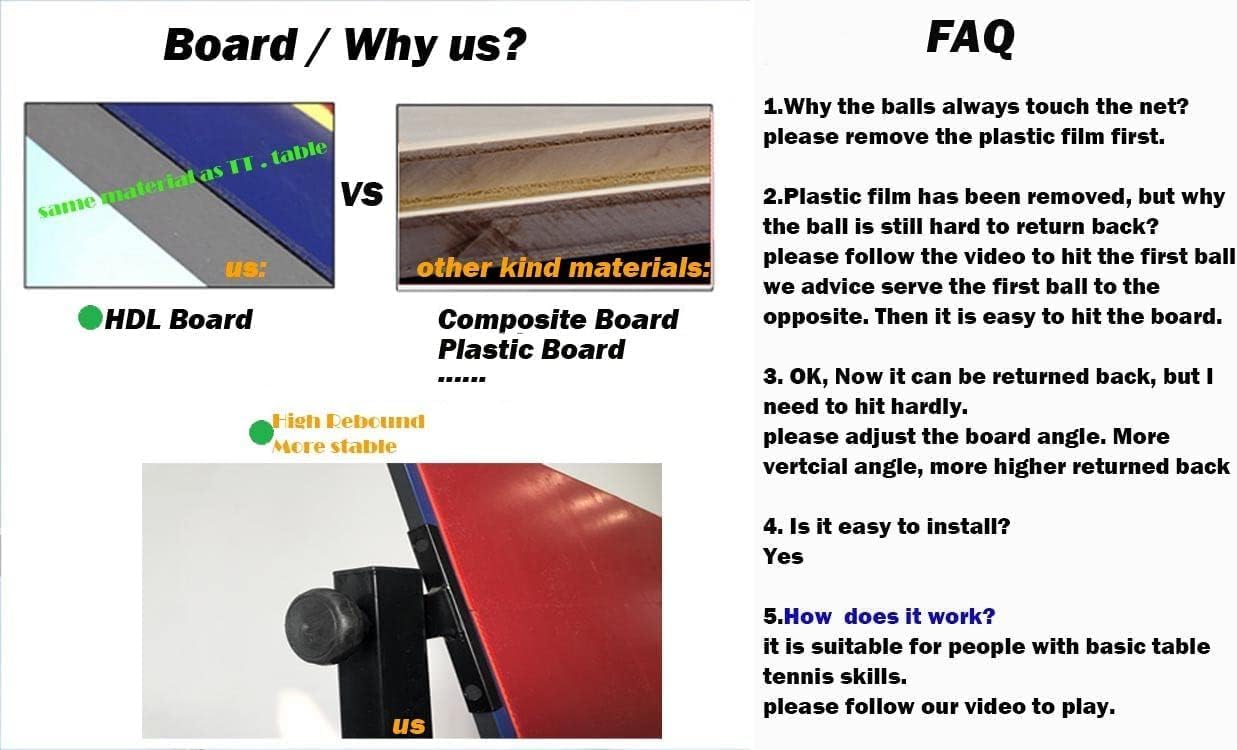 Self training: Play without training partner. unlike robot machine, this ball returned from rebound board like hit back by a real people. 2nd Generation product: Developed by professional team: a) 8 rubbers instead of 6 rubbers for covering more area. b) strong steel wheels instead of plastic. c)astringent rubbers & Glue-free sponge instead of adhesive rubbers for longer service life. Material: The wooden rebound board, the robust steel frame and the steel wheels using the same material as professional ping-pong table to ensure perfect playing experience. Easy to install: complex parts like wheels & adjustable fixture has been fixed in advance. Video: Please follow guidline videos to install & practice. Tips: This return board suitable for people with BASIC table tennis skills. Like new normal rubbers, it has some houttuynia odor. Smell allergy please be used with caution.