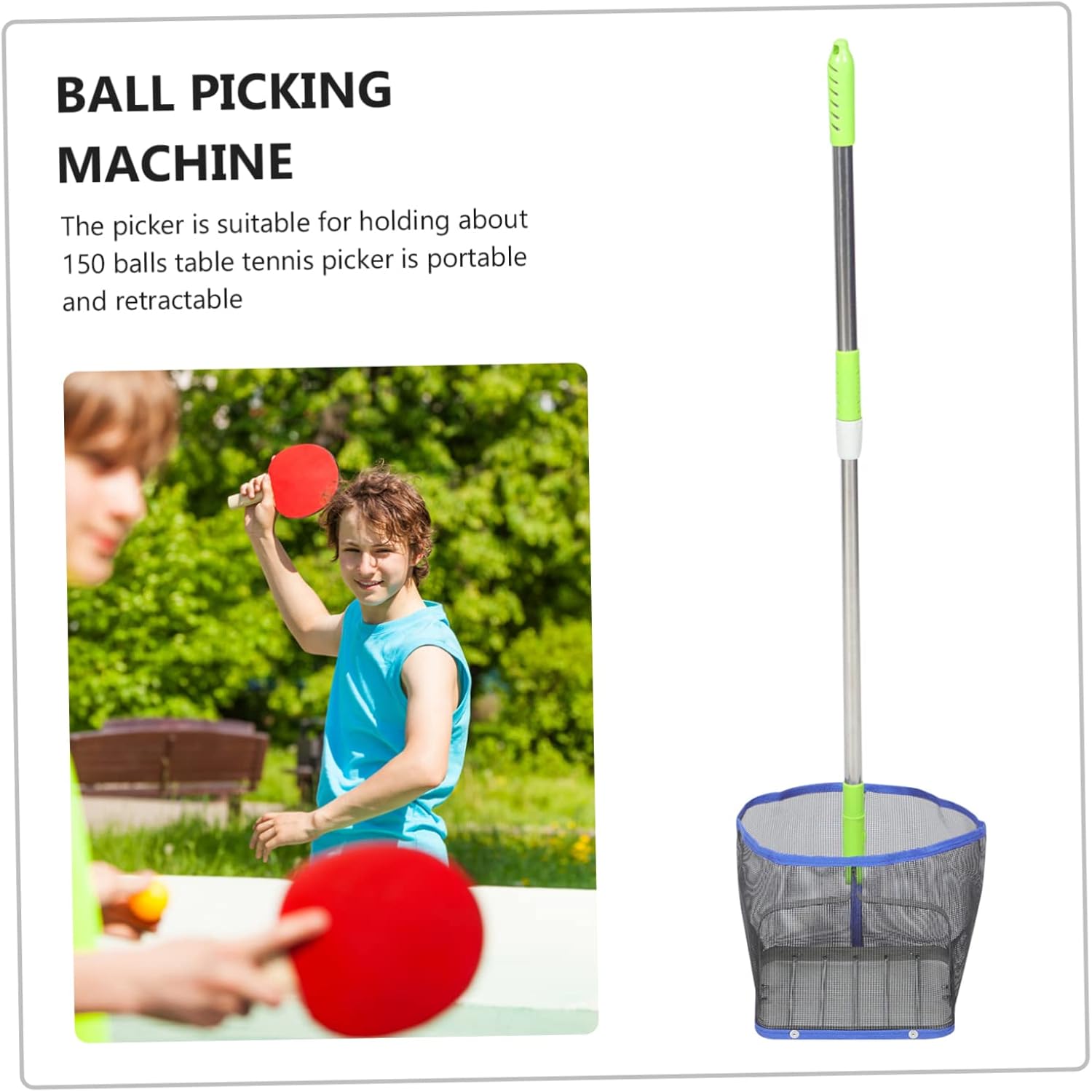 Package Include 1 x Table Tennis Picker Characteristics -Color:As Shown tennis picker -Size: 100.00X21.00X21.00cm/39.30X8.25X8.25in professional balls tool -Material:Stainless Steel, ABS creative tennis tool -The efficient Table Tennis Picker can save your table tennis training time small balls pickers. -The material is and , which is wear resistance and for the long time use portable picker. -This net bag with big , you do not need to spend much time in finding and balls backwards and forwards picker outdoor. -The retractable grip allows you to up a -pong in the distance without bending or walking table tennis collector. - up the with the spring of high strength line, will not damage the table tennis table tennis catcher.Goods Informationportable picker Large capacity design, and can collect many balls at once. picker outdoor Providing the maximum convenience for you, very convenient to carry.upper tennis picker This Table Tennis Picker is made of , rod body and up net bag, for long-term use.gym picker With the help of picker, you can quickly and your balls
