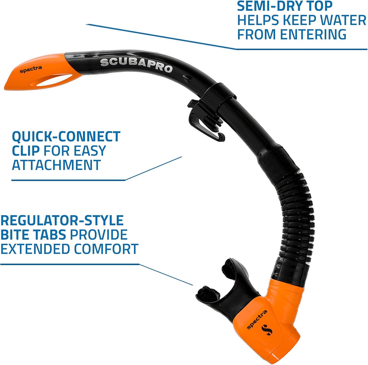 This snorkel is tops when it comes to breathing comfort and ease of clearing. The large-bore upper tube is rigid for stability and allows plenty of airflow, while the corrugated lower tube can be easily positioned when being used, and hangs out of the way when not being used. The semi-dry top helps prevent water from entering, the purge valve positioned at the lowest point makes quick work of any water that does sneak in.