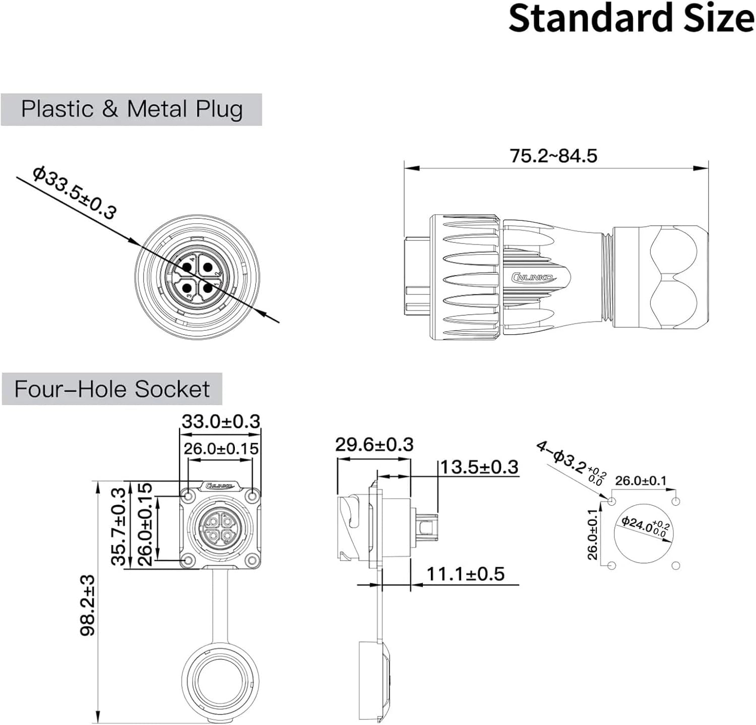 Electrical ConnectorM24 300V Waterproof Connector 3 Pin 4 Pin E-bike Charging Power Panel Socket Electrical Cable Features:300V Voltage CapacityWith a voltage capacity of 500V, this connector can handle high-power applications safely and effectively.IP68 Waterproof RatingThe IP68 M24 connector boasts a high IP68 waterproof rating, ensuring reliable performance in wet conditions.E-bike Charging PowerDesigned specifically for e-bike charging, this connector provides efficient power delivery for your electric vehicle needs. Panel SocketFeaturing an panel socket design, this connector ensures secure and reliable connections in harsh environments.3 Pin 4 Pin OptionsAvailable in both 3 pin and 4 pin configurations, this connector offers flexibility for various electrical systems.==========Hign-concerned Chemical : NoneModel Number : DH-24Cable specification : 2.5~4mm²/14~12AWGDiameter range : Tolerance 10.5mm~14mmAssembly wire : SolderingCurrent rating : 25AOperating voltage (AC.V.rms) : 300VContact resistance(Max.) : 1 omegaWithstanding voltage (AC.V) 1 minute : 2000VInsulation resistance(Min.) : 500m omegaProtection level : IP68Type : Wire connectorApplication : Audio & Video,Lighting,Power,Signal