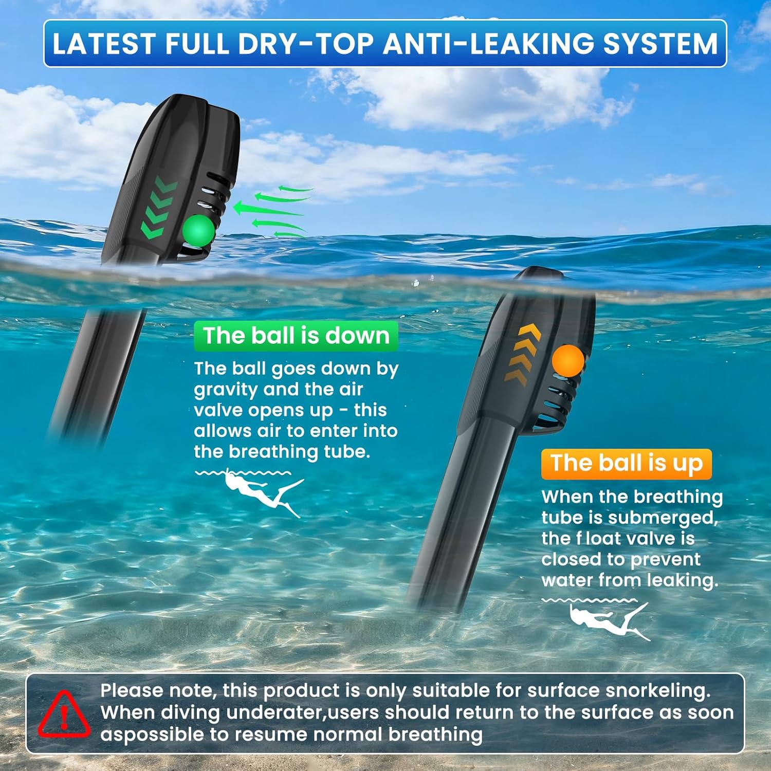 Full Face Snorkel Mask with 180° Panoramic View: Unlike traditional snorkel masks, this full-face design lets you breathe naturally through your mouth or nose while snorkeling. The mask features clear, flat lenses that prevent distortion, reduce glare, and provide a wide, comfortable view of the underwater world.