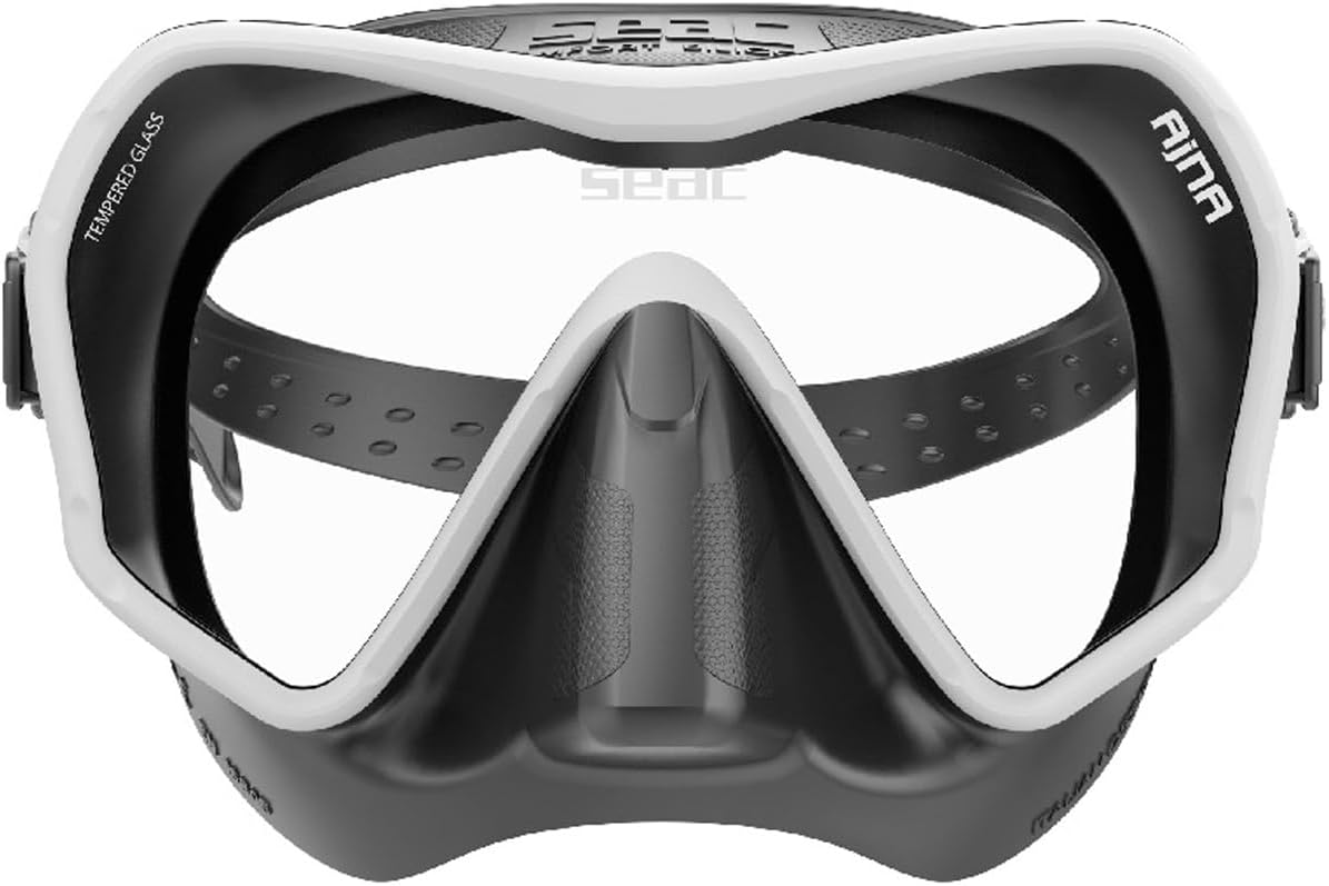 Seac Ajna is a single diving mask made with frameless technology. This leads the lens to be closer to the eyes and thus increases the field of vision. The tilt of the lens avoids image distortion. The SEAC Ajna mask is then characterized by a fluid and discreet design. Shell and face, both made of 100% silicone, blend into a continuous line. The result is a diving mask as comfortable as it is beautiful on any face. The face shape of the SEAC Ajna diving mask fits both adults and the slimmer face of younger divers. Durable and comfortable 3D swing buckle allows for quick adjustment even with thick neoprene gloves. SEAC Ajna is sold together with a practical semi-rigid case with carabiner to store the mask after use.