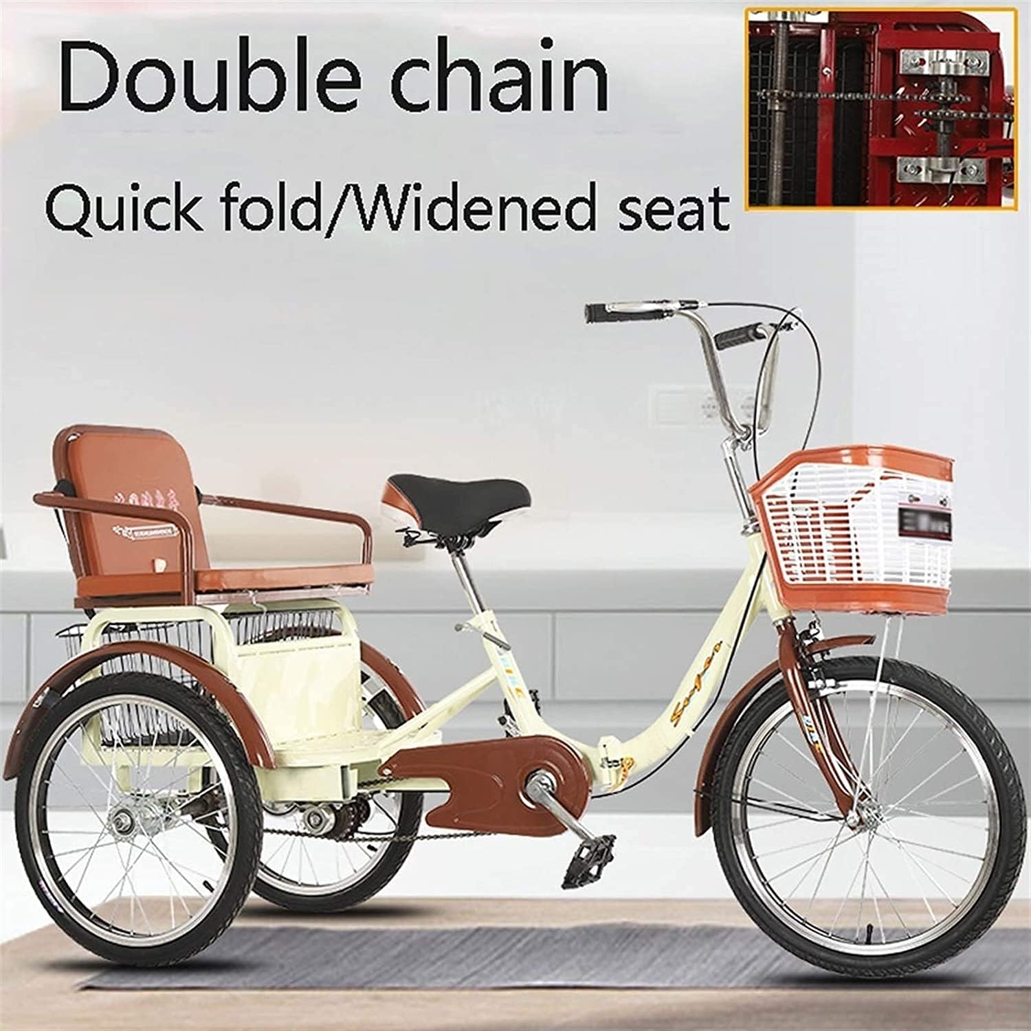 ※(. ? ? ?)※ Bicycle is the best gift for parents and family. Your wife can use it to pick up and drop off children. ※(. ? ? ?)※ Please note: You need to install it yourself, the installation is relatively simple, you can contact us if you have any questions. Since the tricycle is a large product, the product may be slightly scratched during transportation. If you mind, please don't buy. Product name: Adult scooter for the elderly e: High carbon steel e Handlebar: Aluminum stainless steel handlebar Saddle: Comfortable leather saddle Fork: High carbon steel fork Chain: Steel chain Crankset: 32T Crankset Rim: 20-inch aluminum alloy edging rim Tires: Mountain bike pattern anti-skid tires Brake: special brake for tricycle with built-in bearing Flywheel: 16T (teeth) Pedals: high wear-resistant non-slip pedals Front hub: electroplated/high carbon steel hub Rear hub: Electroplated high-carbon steel hub with built-in bearing The package includes: Adult tricycle x 1 Tail light x 2 Raincoat x 1 Pump x 1 U lock x 1 Bell x 1 Installation tool x 1 ※(. ? ? ?)※ You can contact us at any time if you have any questions in the process of buying products, we will ask you to answer your questions, and hope that you have a happy shopping and bring you a happy shopping experience!
