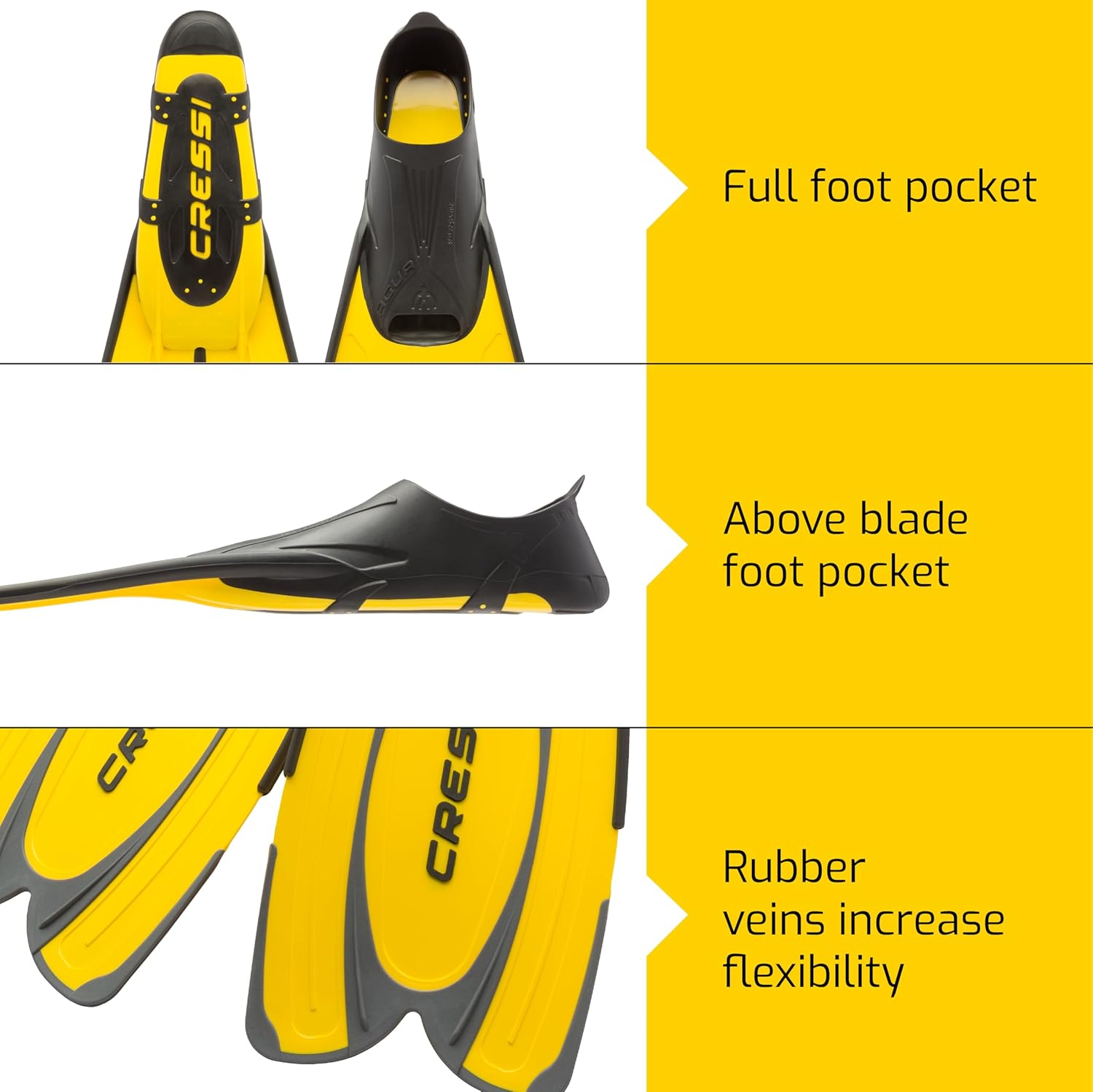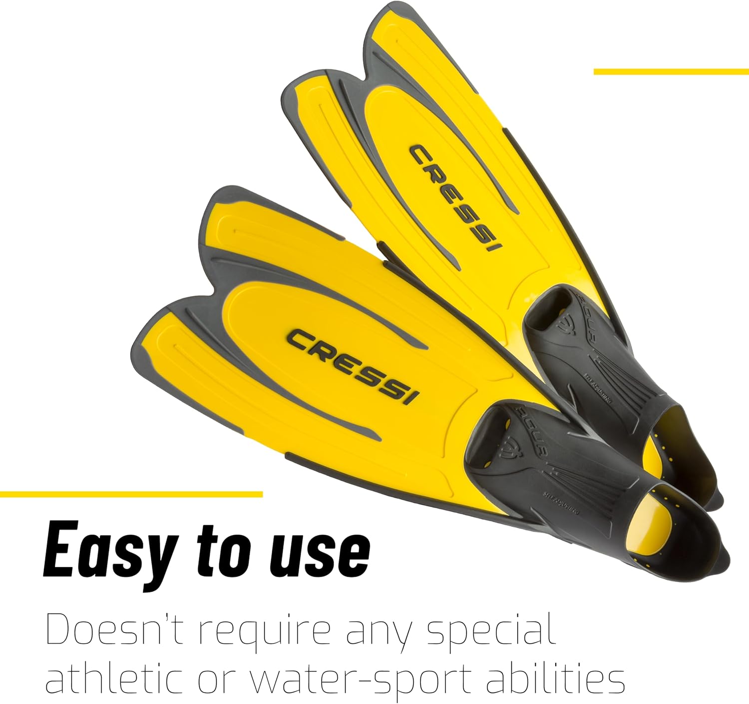 Agua is a very easy fin to use, and doesn't require any special athletic or water-sport abilities, yet it still delivers excellent performance without tiring your feet.Thanks to the latest technology and Cressi's experience in developing these products, we've been able to markedly decrease the weight of this fin compared to others in its category, while still preserving excellent responsiveness.The foot pocket features the original Self Adjusting Foot Pocket system, which thanks to the special softness and elasticity of the blends makes for a consistently soft and adherent fit.