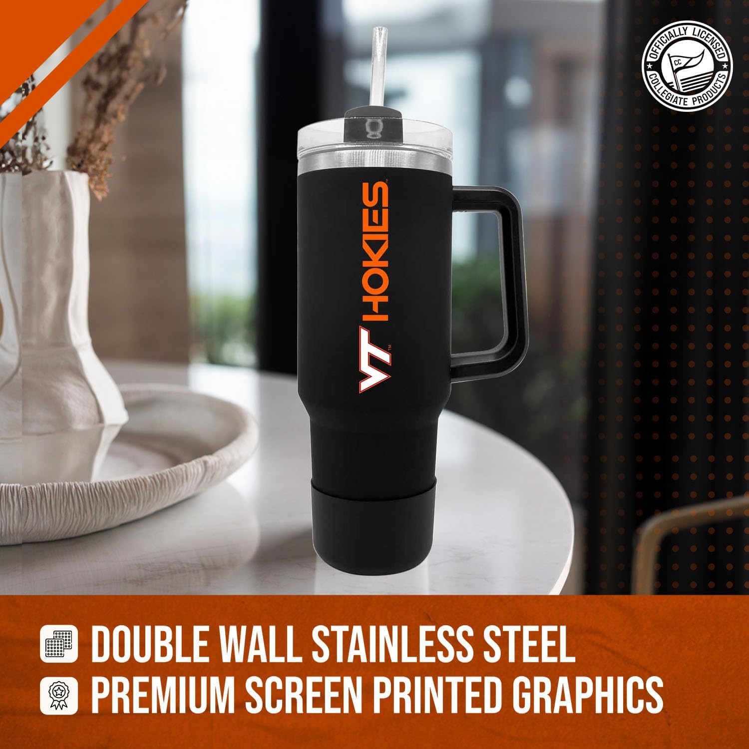 Our stainless steel 40 oz tumblers with handle and straw are designed for constant use in any type of setting! At a sports game? These insulated tumblers are compact and can fit in most cup holders and even feature a no slip grip on the bottom to keep condensation away! On the move? Our contoured spout or straw options makes it easy to sip on the go! No matter the setting, show your school pride while properly and efficiently preserving the desired temperature of your beverage! This Virginia Tech Hokies travel tumbler also makes a great gift! Combine the 40 oz Virginia Tech tumbler with a Virginia Tech pillow or a Virginia Tech blanket and give a whole haul of Hokies gear to your favorite alumni! All of our products feature the officially licensed team colors, logos and lettering. We don't skimp on quality in any way. The colors are always vibrant and the graphics are always accurate and brimming with team spirit.