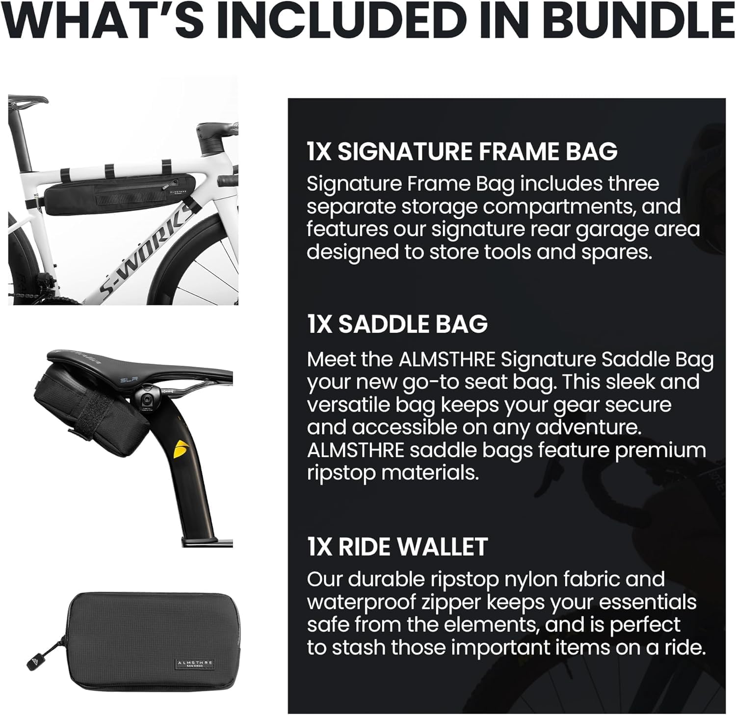 | Style Name | Almsthre Frame Bag, Saddle Bag & Ride Wallet Bag |