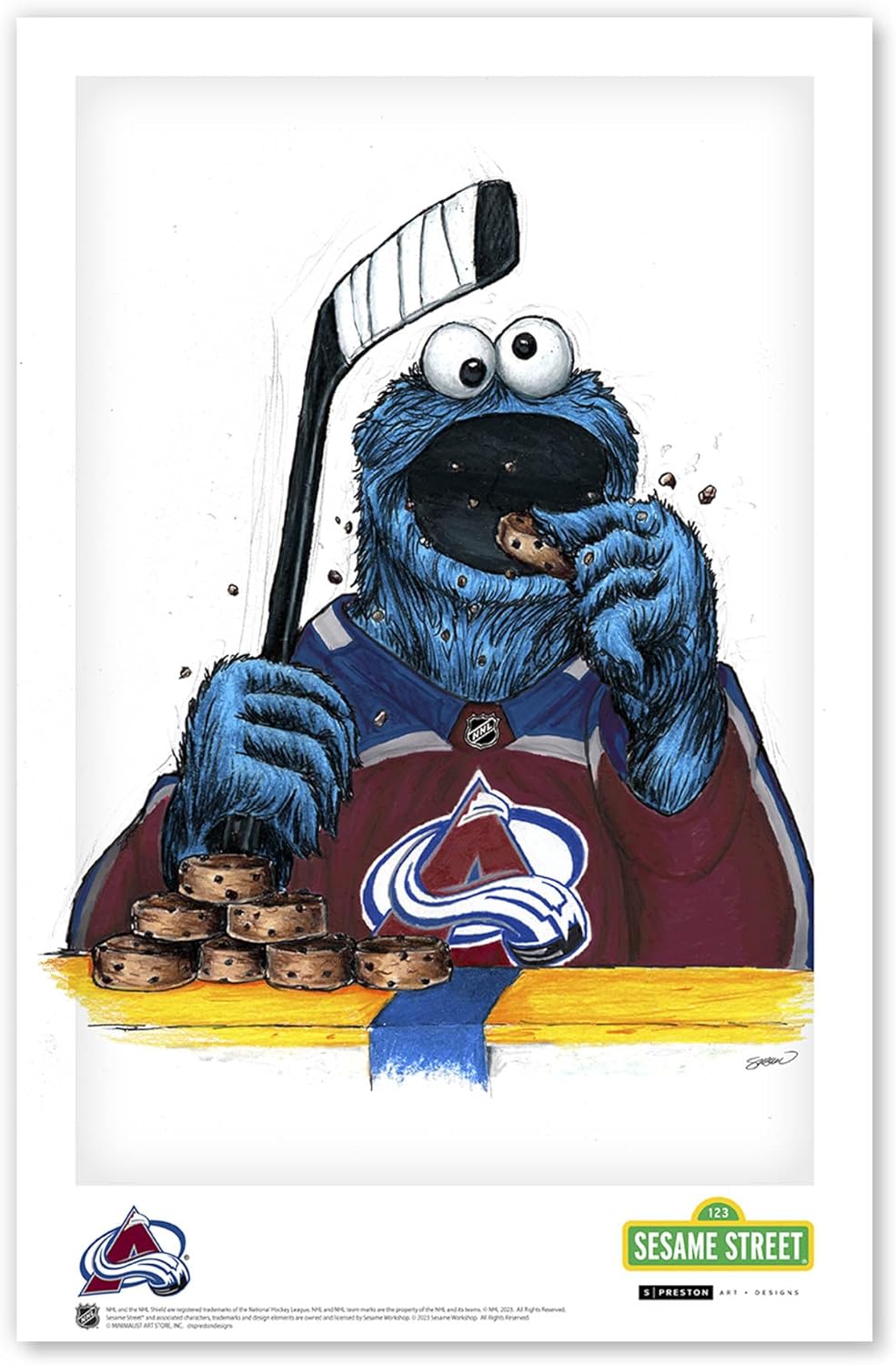 Cookies and Biscuits - Colorado Avalanche Sesame Street officially licensed art poster. S. Preston is a graphic artist born in Canada and now living in sunny California. Melding his two passions for sports and clean design, S. Preston has defined himself with his unique perspective in the work of sports branding and graphic arts. Simply, his designs ignite a feeling of reminiscence and make an emotional connection between sports and art. This reaction has made this series an Internet sensation. In 2016, S. Prestonโs artwork was added to the permanent archives of the National Baseball Hall of Fame in Cooperstown. Please keep in mind there may be a slight variation from screen to printed art. Printed on premium head bond paper. S. PRESTON ART + DESIGNS | MINIMALIST ART STORE, INC.