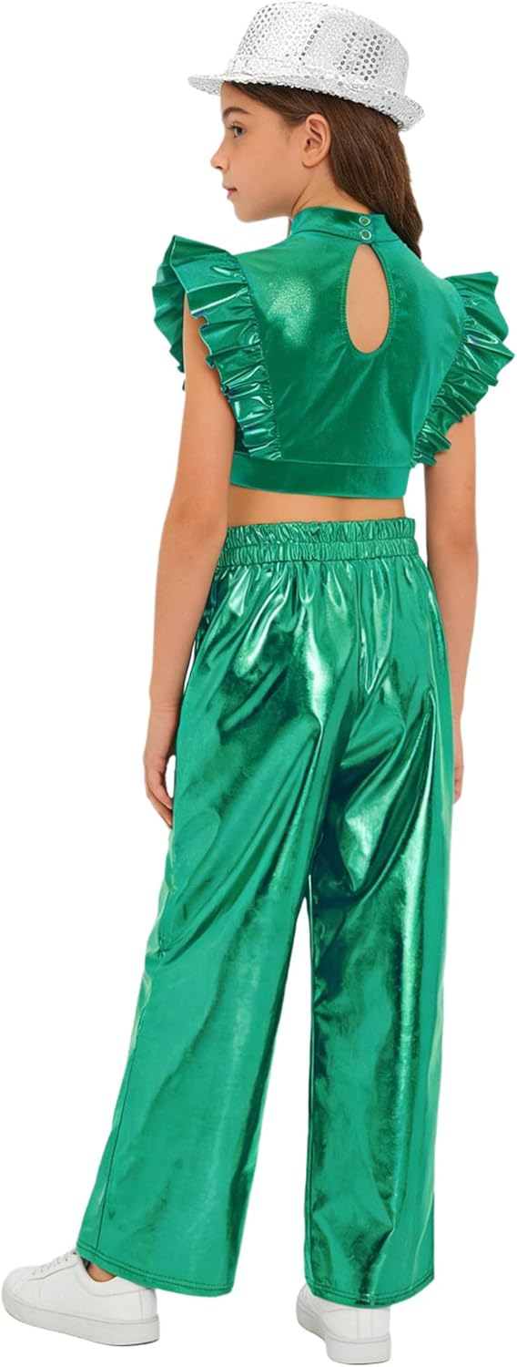 Set Include: 1Pc Crop Top, 1Pc Pants, 1Pc Hat Condition: New with tags Material: 85% Polyester, 10% PU, 5% Spandex Tag No.---|---Recommended Size---|---Pants Length---|----Pants Waist---|-------Hip------|----Top Length----|------Chest-- ---6------|-----------6 Years----------|-----29"/74cm-----|---19.5"/49.5cm---|---31.5"/80cm---|----10"/26.5cm----|---23.5"/60cm ---8------|-----------8 Years----------|----31.5"/81cm----|----20.5"/53cm----|---33.5"/85cm---|----11"/28.5cm----|---25.5"/65cm ---10-----|----------10 Years----------|----34.5"/88cm----|----22"/56.5cm----|----35"/90cm----|----12"/30.5cm----|---27.5"/70cm ---12-----|----------12 Years----------|-----37"/95cm-----|----23.5"/60cm----|----37"/95cm----|---12.5"/32.5cm---|---29.5"/75cm ---14-----|----------14 Years----------|-----40"/102cm----|----25"/63.5cm----|----39"/100cm---|---13.5"/34.5cm---|---31.5"/80cm ---16-----|----------16 Years----------|----42.5"/109cm---|-----26"/67cm-----|----41"/105cm---|----14"/36.5cm----|---33.5"/85cm