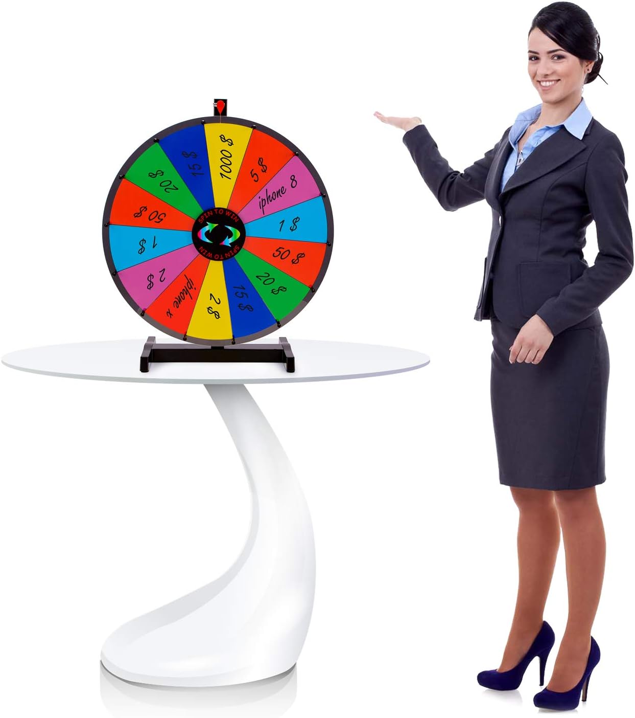 Heavy Duty - Built to Last: Strong stainless steel base, a sturdy metal support bar and firm rubber grips at the base, ensures balance and a smooth, free spin that will land randomly! Use this prize wheel spinner with stand for a long time!