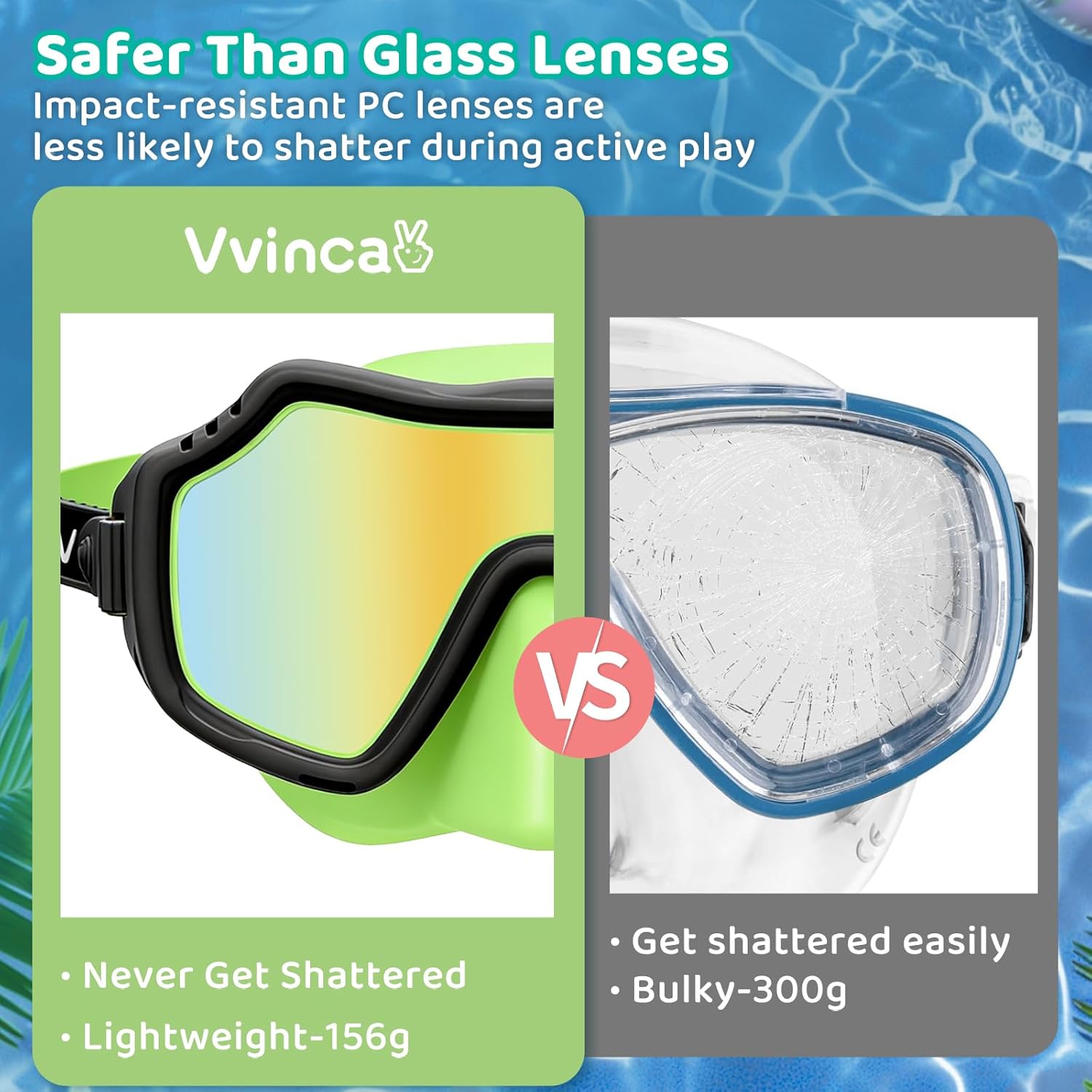 Turn Fear into Fun with the Ultimate 2-Pack Swim Solution Make every splash count with the Vvinca 2-Pack Kids Swim Goggles with Nose Cover. Designed specifically for active boys and girls ages 3-15, this value set is the ultimate solution for parents seeking safety, durability, and convenience. Whether you are prepping for a family vacation or starting swimming training, our masks solve the biggest hurdles young swimmers face. Breathe Easy, Swim Confidently For many children, the fear of water rushing up their nose is the biggest barrier to learning. Our innovative swim mask with nose cover creates a secure, air-tight seal that allows kids to exhale gently underwater. This anti-choking design eliminates the need for manual nose pinching, helping beginners and toddlers overcome anxiety. It is the perfect snorkeling gear for kids to build confidence in the water. Safety First: Shatterproof Protection Active play requires gear that can take a hit. Unlike heavy tempered glass masks that are prone to cracking and unsafe for jumping, Vvinca features shatterproof Polycarbonate lenses. This ultra-lightweight material withstands impact and jump entries, offering superior safety for energetic play. It is the ideal diving mask for both the swimming pool and beach essentials. Double the Value for Busy Families Why stop at one? This 2-pack set is a game-changer for siblings or parents who always need a backup pair. No more fighting over gear or panicking when a pair gets lost. Keep one in your swim bag and one in the car to ensure you are always ready for spontaneous water fun. Comfort Meets Clarity Say goodbye to foggy lenses and painful raccoon eyes. Our HD anti-fog lenses offer a crystal-clear 180° panoramic view, correcting underwater distortion to prevent dizziness. The soft silicone skirt is odorless and hypoallergenic, molding gently to growing faces for a guaranteed leak-proof fit.