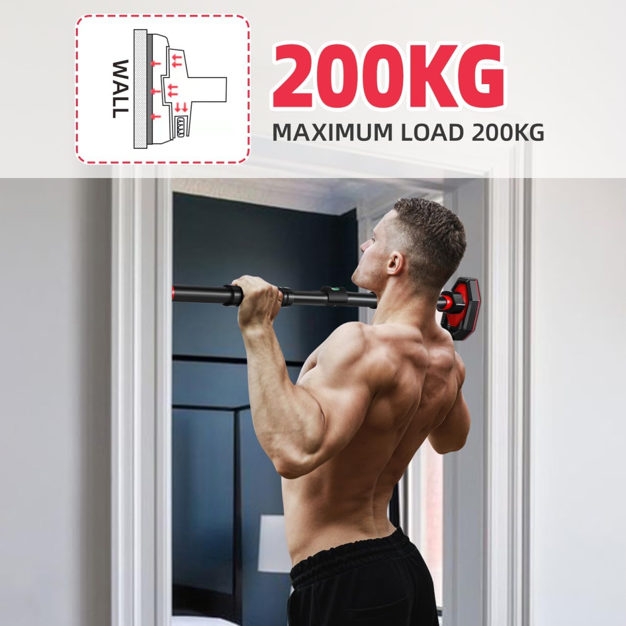 Description:This versatile fitness equipment is ideal for a variety of exercises, including pull-ups, chin-ups, and hanging leg . It comes with a comfortable and nonslip grip, while the easy installation process means you can start your workout routine in no time. It's a great way to stay fit and healthy without leaving the comfort of your home.Features:*Color:Black*Material:Rubber, steel, sponge*Size: 100.00X15.50X7.00cm/39.30X6.09X2.75in 65.00X15.50X7.00cm/25.55X6.09X2.75in *Load-bearing capacity: 200 KG*Note: Recommended door frame width is between 65-100cm.-Home fitness: Transform your doorway or other indoor place into a with this pull-up bar, designed for easy indoor use and effective workouts-Wall-friendly design: This door frame fitness bar avoids wall damage with the no-drill installation, providing a secure fit without the need for permanent fixtures-Multi-functional fitness tool: Perform pull U.S, chin U.S, and other body exercises, or lower the bar for sit U.S, push U.S, and stretching to enhance your fitness routine-Nonslip base: The pull-up bar for door is equipped with nonslip pads on both ends. This enhances safety and prevents accidents or slips while performing pull-U.S-Padded grip: This Chin Up Bar without Screw features a comfortable grip with padding, allowing for a secure and ergonomic hand placement during workoutsPackage Including:1 x Pull up Bar for Doorway2 x accessories