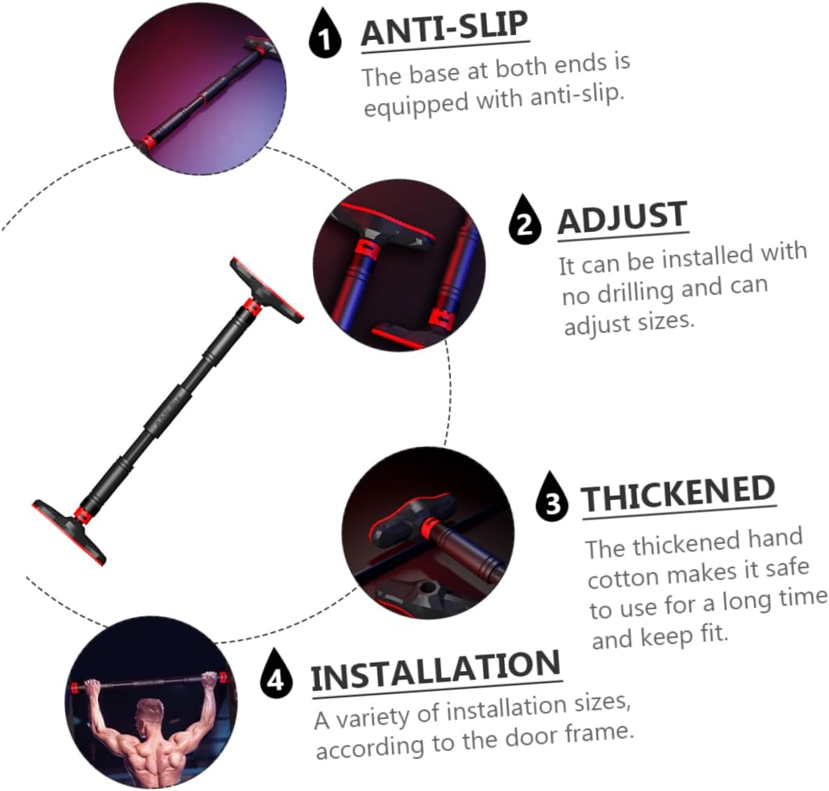 Package List 1 x Pull-up Bar Characteristics -Material: Steel, EVA, PVC Non-punching Pull Up Bar. - It can be installed in any cement walls, security doors, solid wood doors, corridors but not including fragile door frames Strength Trainer Device. - Made of steel, EVA and PVC materials, for use Pull-Up Equipment. - Strength training any muscle including arms, legs and Abdomen. Keep fit and get your dreamed body Pull-Up Equipment. - Our home gym bar allows you to perform a variety of upper body strengthening exercises Doorway Pull Up Bar. - This pull up bar is designed with two anti-skid devices on both sides, which will help you with an easy and fast installation Fitness Equipment.Goods DescriptionFitness Equipment This is a pull-up bar, which is made of steel, EVA and PVC materials, for use.Non-punching Pull Up Bar This pull up bar is designed with two anti-skid devices on both sides, which will help you with an easy and fast installation.Pull Up Bar It can be installed in any cement walls, security doors, solid wood doors, corridors but not including fragile door frames