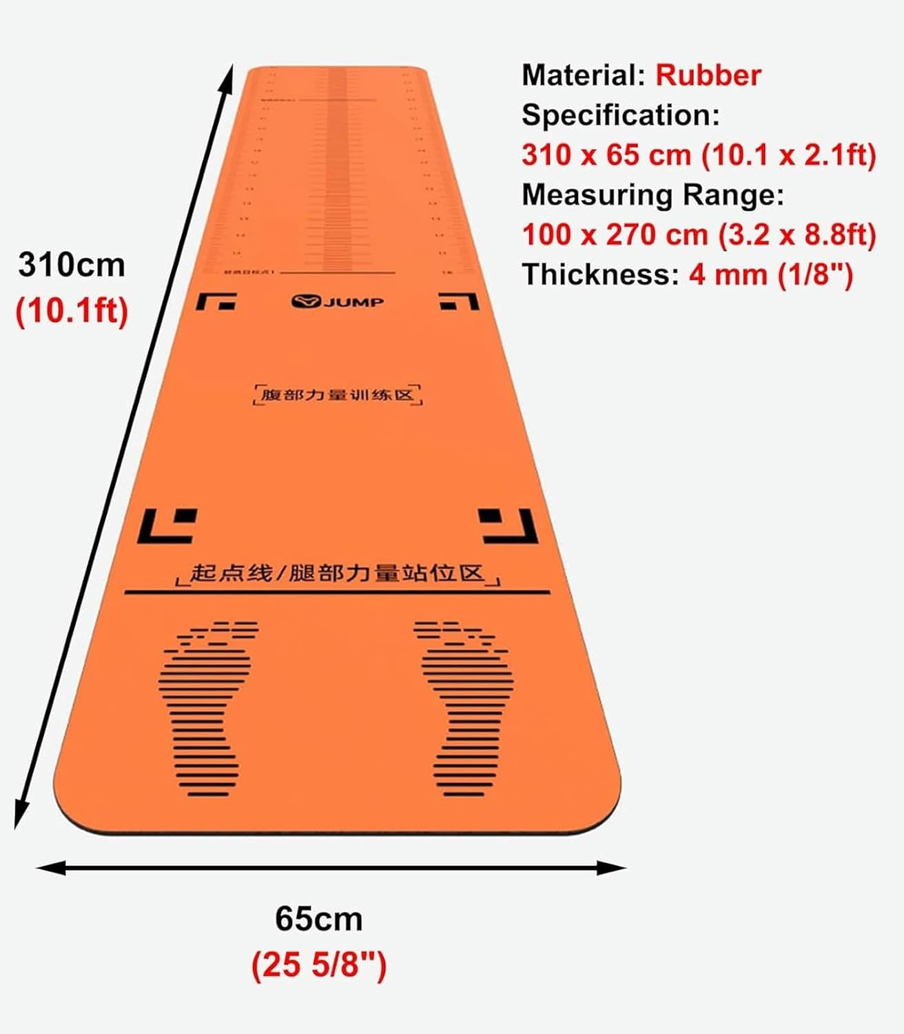 ❁ Can help you accurately measure the distance of each jump, There are other fitness moves you can do, meet your needs.❁ Package Contents:- 1 x Long Jump Mat❁ Specification:- Material: Rubber- Suitable for People: Adults and children- Sizes: 310 x 65 cm (10.1 ft x 25 5/8 inch)- Measuring Range: 100 cm - 270 cm (3.2 ft - 8.8 ft)- Thickness: 4 mm (1/8 inch)❁ Feature:- Double-sided non-slip has strong adsorption- Can perform a variety of fitness movements- Rubber material for comfort and durability- The scale is clear and accurate- Easy to clean, easy to roll-up❁ Please Note:- There may be slightly deviation in dimensions due to manual measurement and printing.- Due to the light and screen difference, the item's color may be slightly different from the pictures.❁ Efficient Customer Service:- In the process of receiving or using the product, if you encounter any problems, please feel free to contact us. We value your comments and offer nice solution for you.