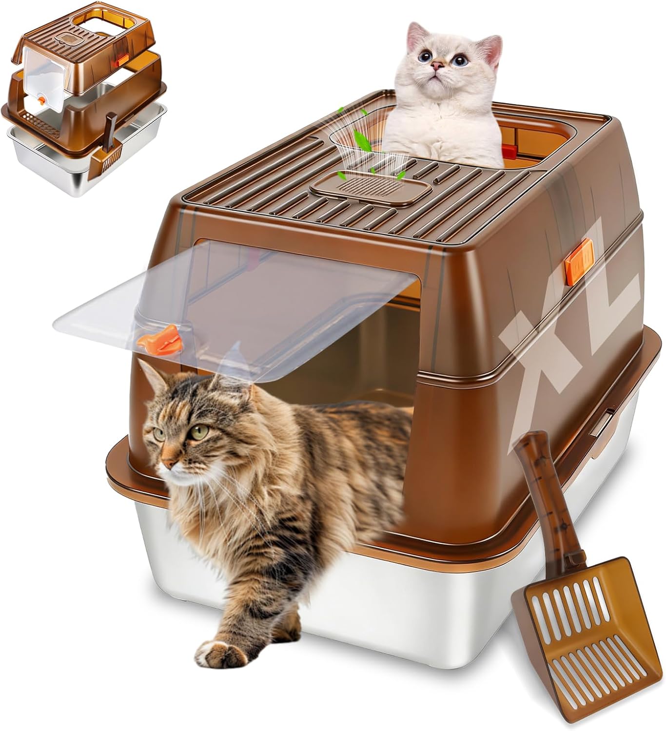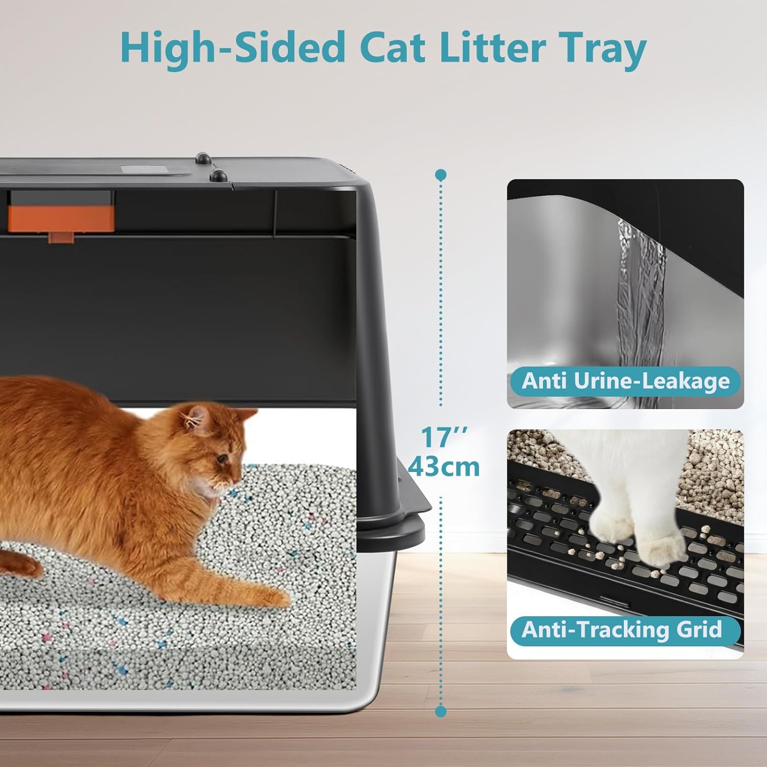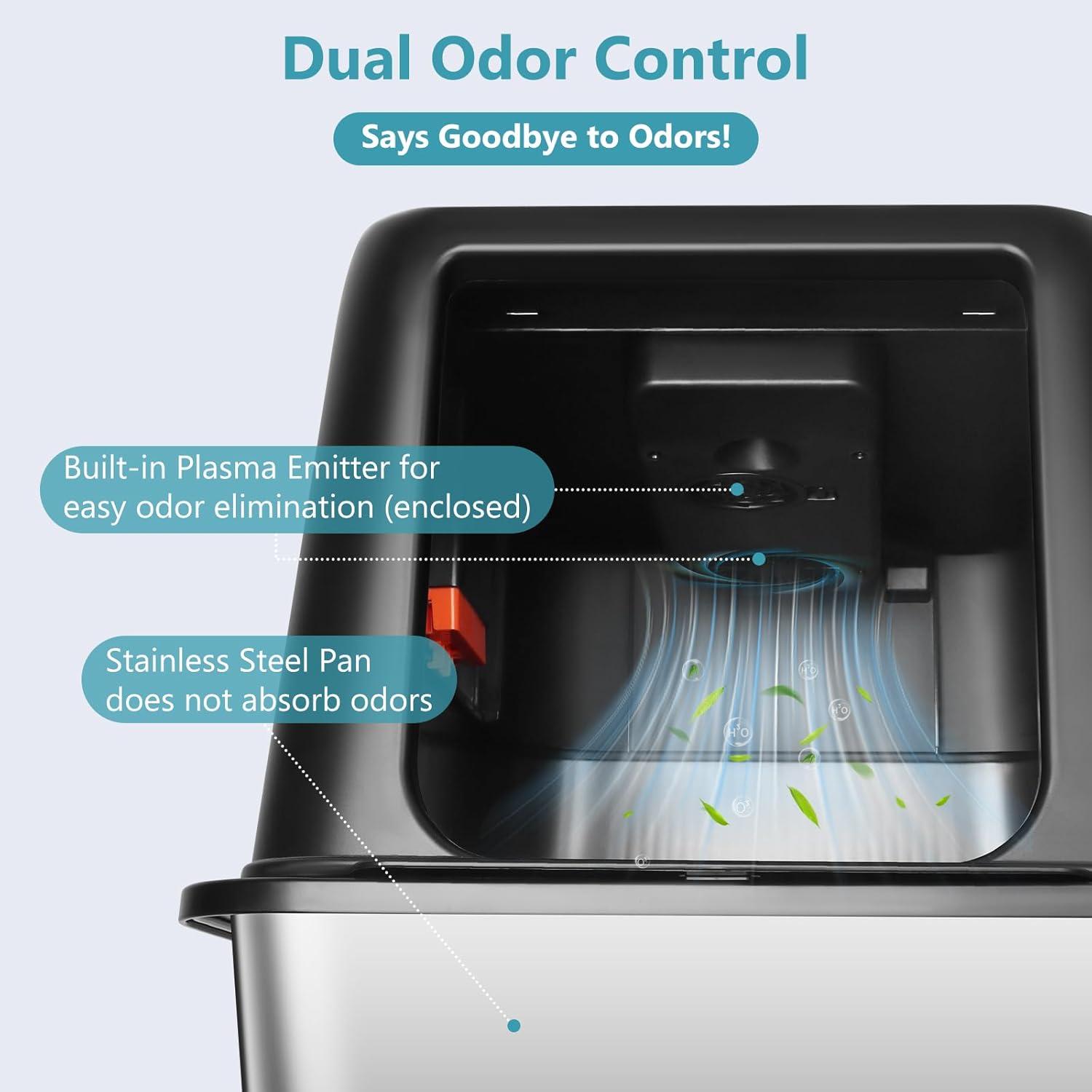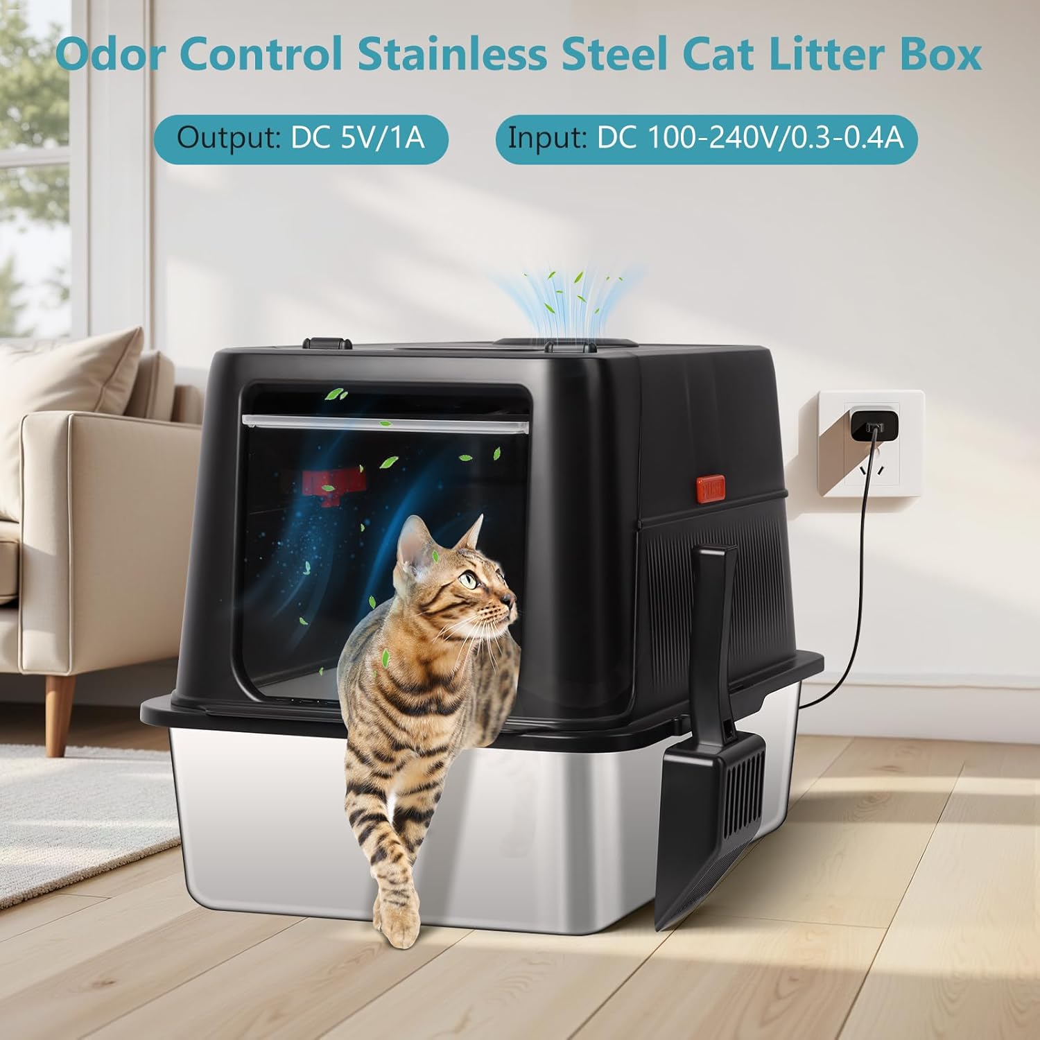 Bartuke Odor Control Stainless Steel Litter Box with Lid - This deodorizing cat litter box is equipped with plasma emitter and adjustable triple-speed fan to effectively eliminate odors. - This enclosed stainless steel cat litter box features smart infrared detection function, which will auto stop working when it senses a cat entering, and restart auto 1 minutes after it leaves. - The 135°flip-top open design makes it more convenient and efficient for you to scoop litter without removing the entire top cover. - This cat litter box is made of stainless steel, this metal cat litter tray features non-stick surface that is easy to clean without leaving any odor. Specification: Color: Black Dimensions: 24’’x16’’x17’’/60x40x43CM Materials: Stainless Steel+ABS Maximum Litter Capacity: 30L Package list: 1x Stainless Steel Pan 1x High-sided Enclosure 1x Top Cover with Swing Door 1x Litter Scoop 4x Non-slip Pads 1x Manual