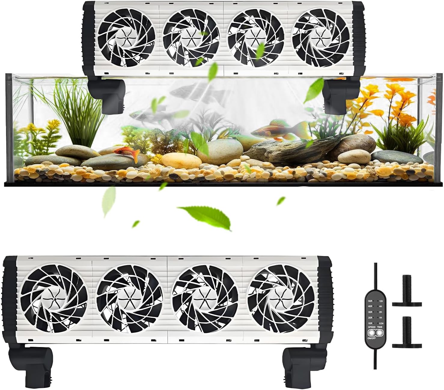Keep your aquatic pets comfortable with this versatile aquarium chiller fan system. Featuring 4 powerful fans with adjustable 5-speed settings, this cooling solution helps maintain optimal water temperature in your fish tank. The thoughtfully designed controller offers 5 timer settings for automated operation, while the 180-degree rotation capability ensures comprehensive coverage. Perfect for both home aquariums and office setups, this cooling fan operates quietly to avoid disturbing your space. The adjustable speed control lets you fine-tune the cooling intensity based on your tank's needs. Whether you're a seasoned aquarist or new to the hobby, this cooling fan system helps create a stable environment for your aquatic life. The versatile mounting options and user-friendly controls make it an practical addition to any tank setup. Ideal for tropical fish enthusiasts looking to maintain consistent water temperatures, especially during warmer months.