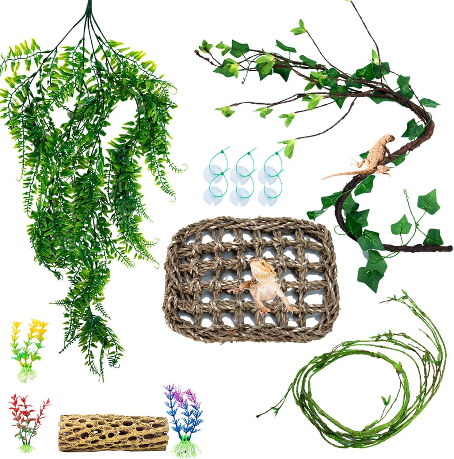 Artificial Reptiles Plant For Climbing Hideouts Terrarium Jungle Bendable Vine Amphibian Habitat OrnamentsFeatures:Decorate your Reptiles terrarium with our artificial Vine, create a realistic tic landscape and comfort for your pet.Artificial Vine Plant ,makes your habitat more alive, suitable for reptiles, beardeddragon, iguanas, lizards, snake tanks for Reptiles enthusiasts, pet store owners... this product caters to different levels of decorative requirements, ensuring satisfaction.Suitable for most types of Reptiles enclosures, terrariums, and indoor plant decorations, it help create a natural tanks and add visual appeal to any setting.This versatile decoration transforms any space into alive environment, enhancing the overall for both you and your pet.Specifications:Component: Simulation of Green Plant, Wood, Suction Cup Diameter: Approx.4cm/1.57inchType: 10 OptionQuantity: 1 SetPackage Includes:1 Set Reptiles Terrarium Plant DecorationNote:1.Please allow 1-2cm errors due to manual measurement, note that you donot mind before order. 2.Due to the differences between different monitors, the picture may not reflect the actual color.