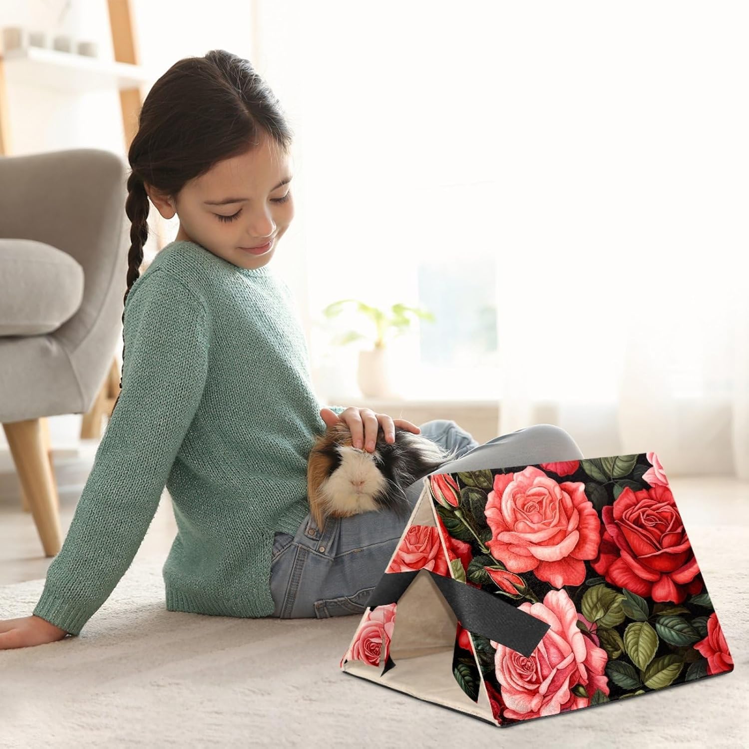 This "Little Hamster Home" is a series suitable for small pets such as hamsters, guinea pigs, rabbits, ferrets, mice, hedgehogs, and chinchillas. It is made of high-quality short velvet fabric and provides a private, warm, and comfortable hiding place, allowing your cute little animals to feel safe. Your baby can play, rest, hide, sleep, or engage in other activities in this safe haven, while also being a warm home. The size of 'Little Hamster House' is 10.2 inches long, 12 inches wide, and 8.5 inches high. The bottom is a foldable PP board, so when not in use, the hamster nest can be folded up without taking up space. By covering it with a layer of blankets, this cabin can become a comfortable hiding place. This small animal bed is made of high-quality soft short velvet fabric, with a sturdy structure that remains stable on the ground and will not collapse on its own. The ultra soft fabric makes your baby feel comfortable and warm in their own cabin. Plush curtains provide a private, warm, and comfortable resting place for your pets, allowing them to feel secure. Specially designed for guinea pigs, hedgehogs, golden bears, sugar kangaroos, hamsters, squirrels, chinchillas, small rabbits, flying dragons, and other small animals. When accidents cannot be avoided, there is no need to worry! This guinea pig bed can be hand washed and machine washed, suitable for air drying.