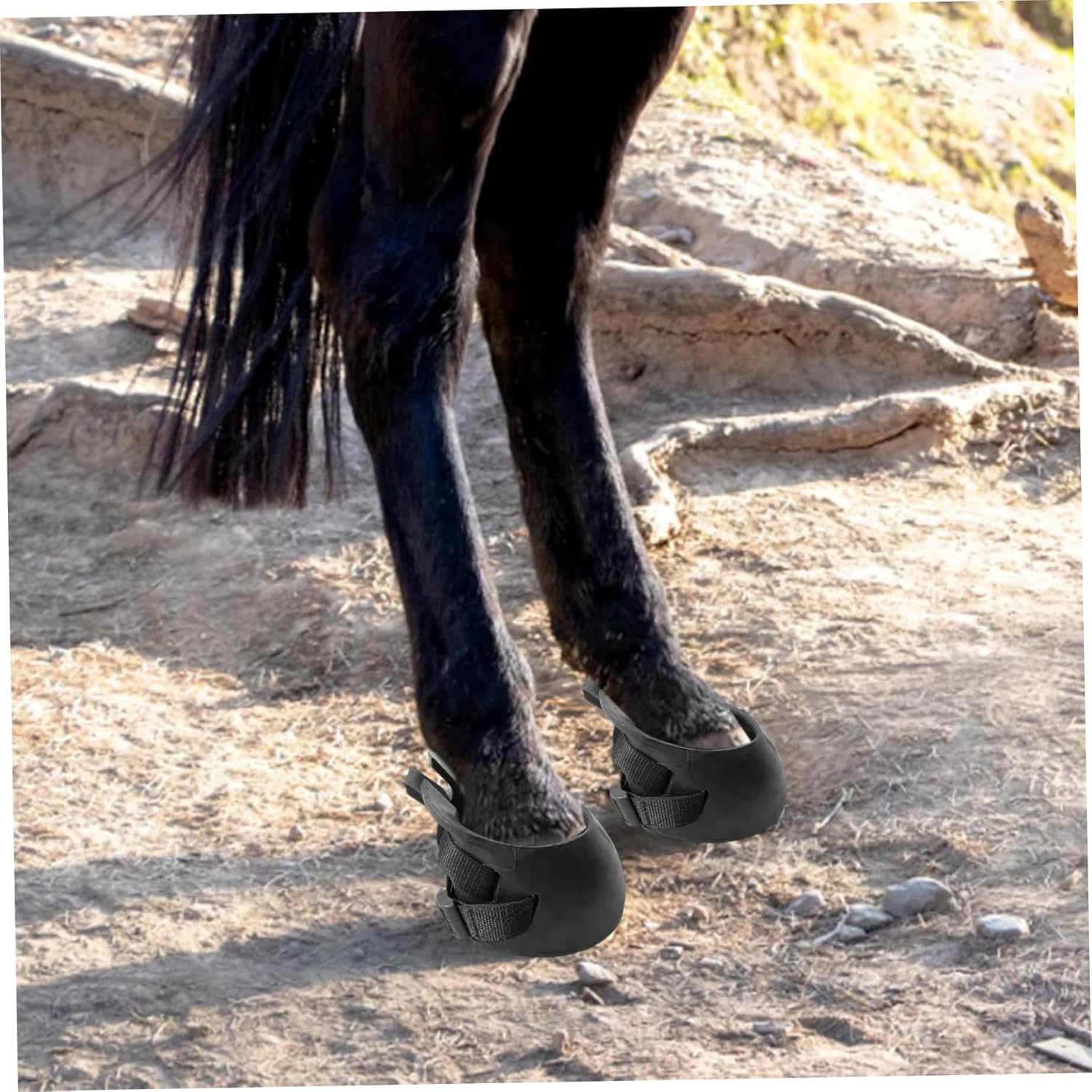 Description: Ensure your horse's hooves are safe and comfortable with these Horse Hoof Boots. Designed to protect injured hooves from dirt, water, and manure, they are perfect for managing wounds associated with laminitis, abscesses, injuries, and thrush. Made from robust rubber with a striped sole, these Hoof Boots for Horses anti-slip protection on concrete and hard surfaces, providing peace of mind during every ride. Easy to clean and maintain, they serve as a protective shield, enhancing the safety and comfort of your horse. Perfect for competitions, training sessions, or rehabilitation, these Hoof Boots are versatile and practical horse accessories. Features:. Hoof Boots For Horses. -Color: Black. -Material: Rubber . -Size. M Size: About 13.2x13.9cm/5.20x5.47 inches. Note: Manual measurement, please allow slight errors on size. The colors may exist slight difference due to different screens. Package Including 1 Pair Hoof Boots For Horses.