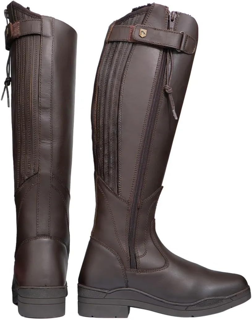 Lining: Fleece. Upper: Leather. Insole Material: Rubber. Sole Features: Durable, Non Skid. Fastening: Touch Fastening Strap, Zip. Fabric Technology: Lightweight, Waterproof. Low Heel. Stitching: Accents. Design: Plain.