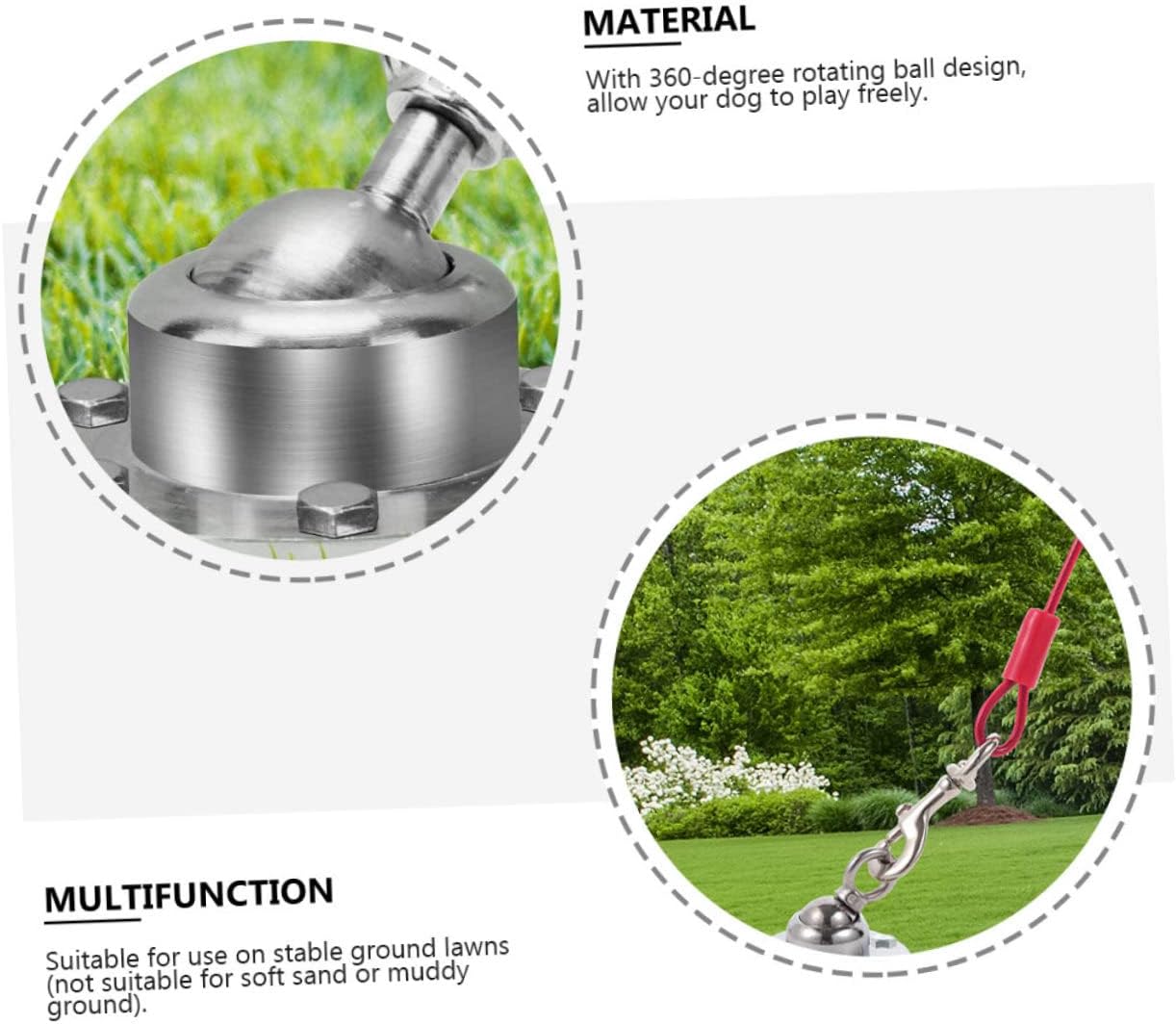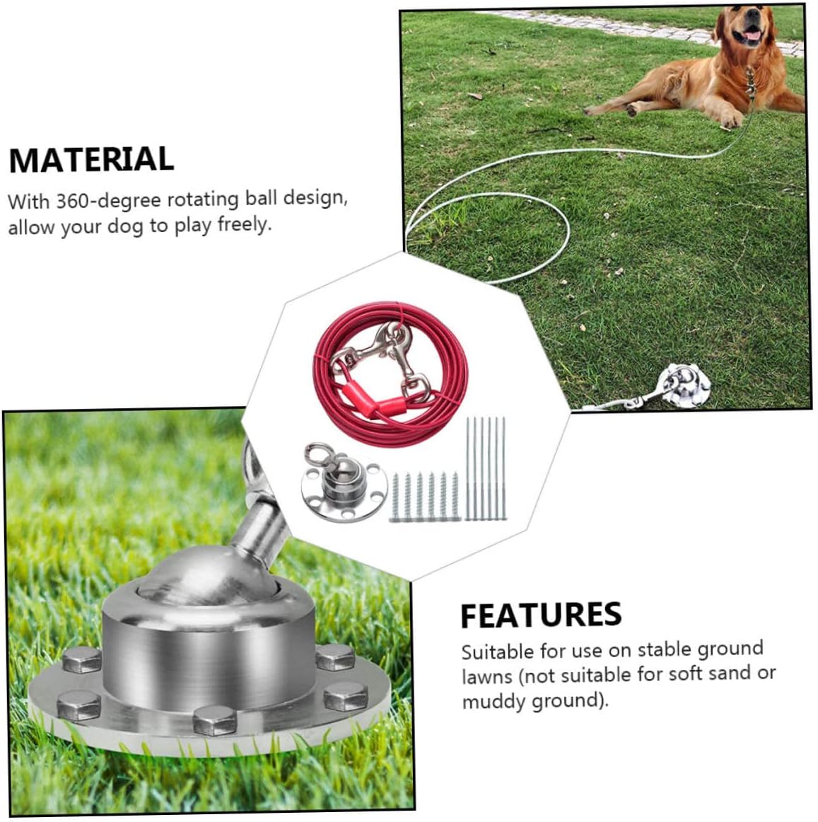 Package List 1 x Rotating Stake 1 x Wire Rope 6 x Long Screws 6 x Short Screws Characteristics -Color: Assorted Color Puppy Pile Out Stake -Size: Approx. 7.20X6.20X2.00cm / 2.83X2.44X0.79in Outdoor Dog Fixing Stake -Material: Stainless Steel dog accessories -Suitable for attaching any harness, leash or chain attachments, saving time and effort Dog Tie-Out Stake. - for yard, camping or other environments where you need a reliable dog stake Rotating Dog Stake. -Compact in size and light in weight, it won't take up much space Outdoor Dog Supply. -360-degree swivel ring helps prevent tangles, more and humanized Rotating Stake for Dogs. -Made of , it is and use You can to use it dog leash.Goods Informationpuppy leash It is one of the choices for you.Wire Rope Stake for Dogs Are you looking for a professional, yet outdoor pet fixing kit? Are you in search of a sturdy, trustworthy tool that can do multiple jobs? , ! Our professional outdoor pet fixing kit must meet you needs