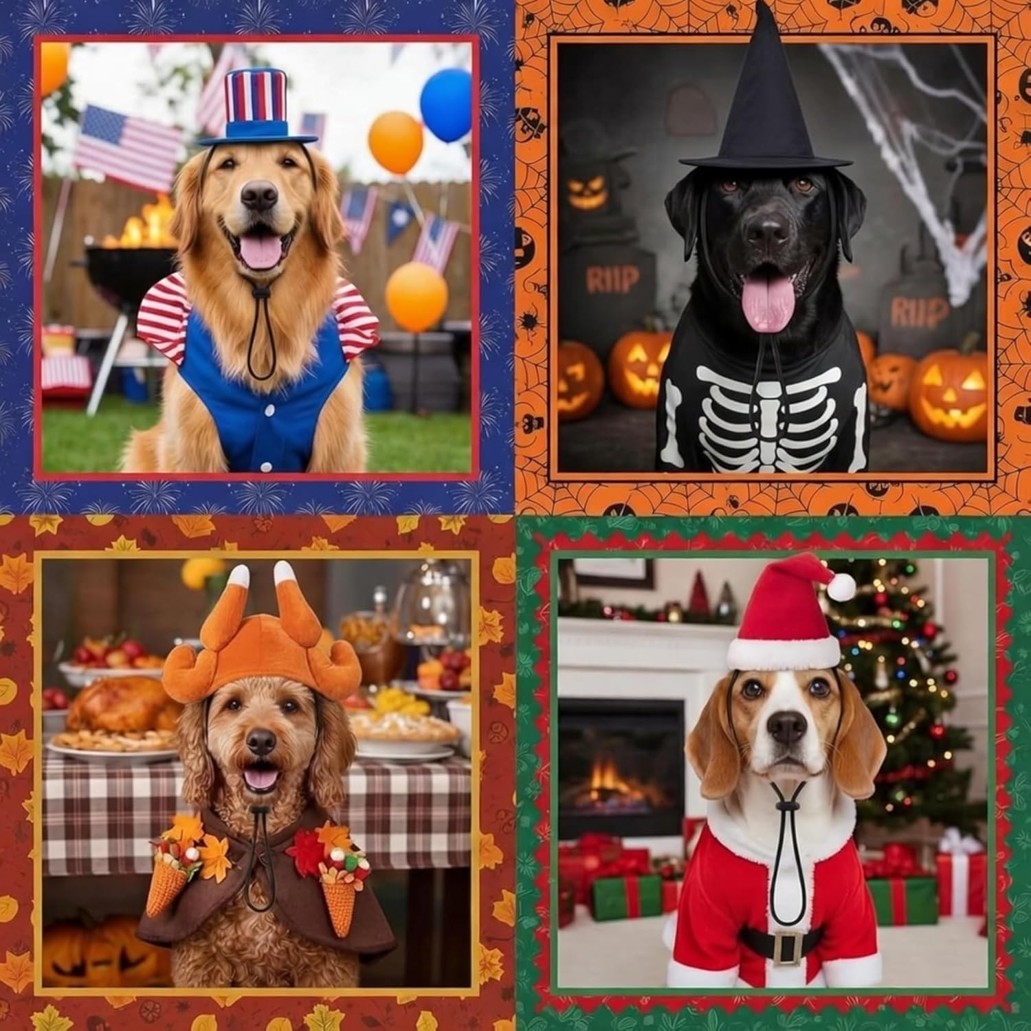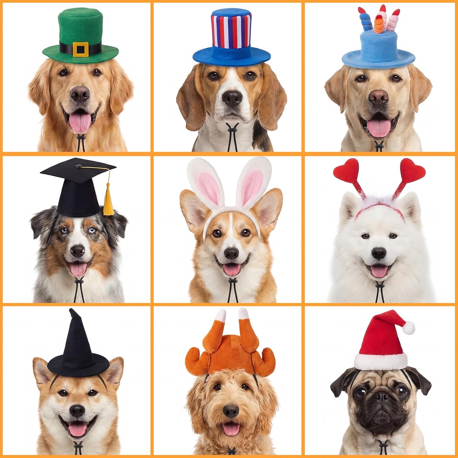 Features: All-Season Festive Variety: 9 themed holiday dogs hats cover major holidays and celebrations throughout the year, giving your pets fun, stylish accessories for photos, parties, and seasonal events at birthday, Valentine's Day, Easter, Irish Festival, graduation, 4th of July, Halloween, Thanksgiving fall, Christmas. Comfortable Adjustable Fit: soft fabric paired with adjustable straps helps each seasonal dog cat hat headband sit securely on small to medium pets, allowing them to enjoy dress-up moments comfortably during activities and family gatherings. Specifications: Material: soft fabric and adjustable straps Color: multi-theme holiday color assortment Size: fits most small to medium dogs and cats Package includes: 9 x All seasonal hat for dogs and cats Notes: Manual measurement, please allow slight errors on size. The color may exist a slight difference due to different screen displays Small items are included, please keep them away from pets in case of choking risk. Before purchase, confirm whether the product size is suitable for your pet, and observe the pet's reaction when using. Please remove the product in time if there is any discomfort
