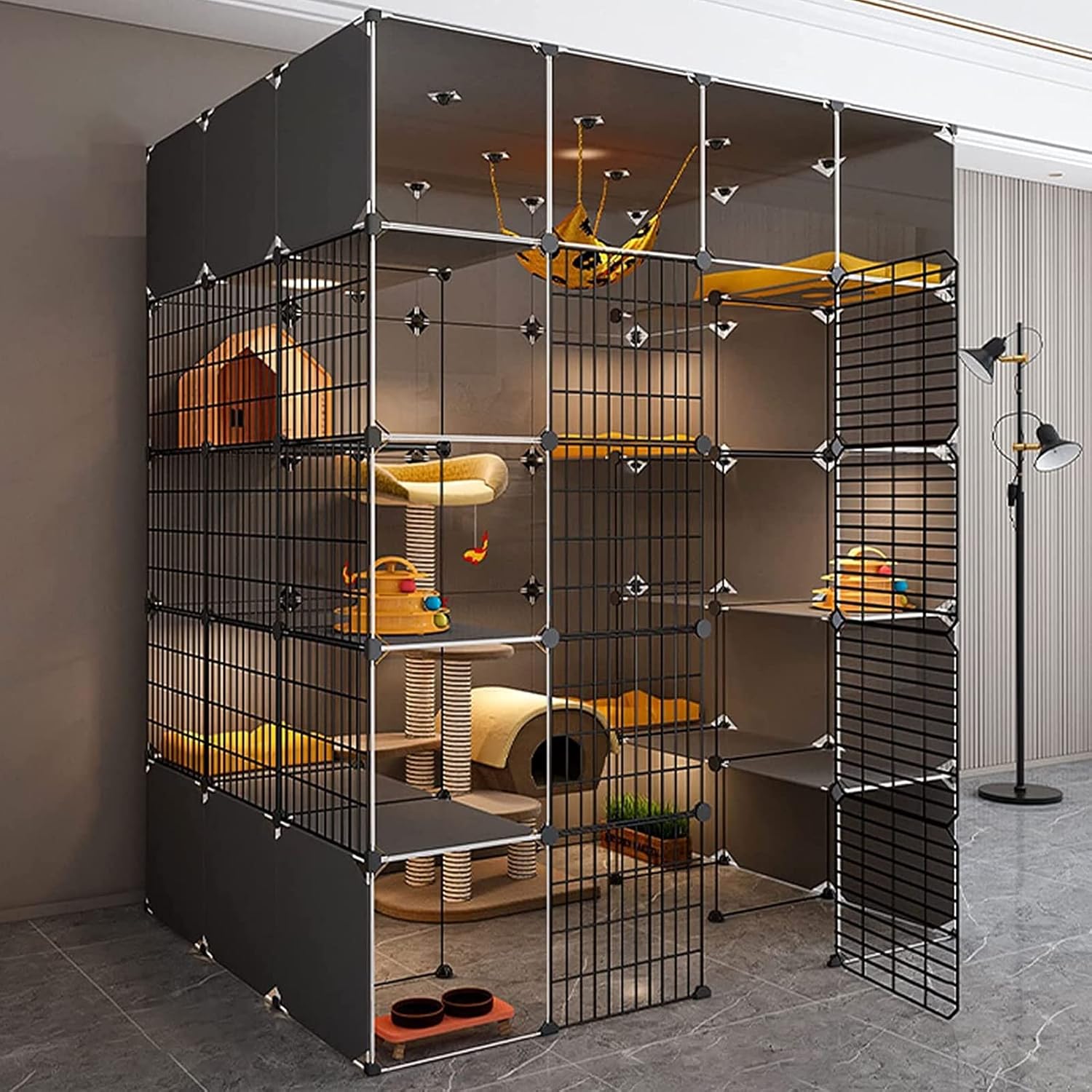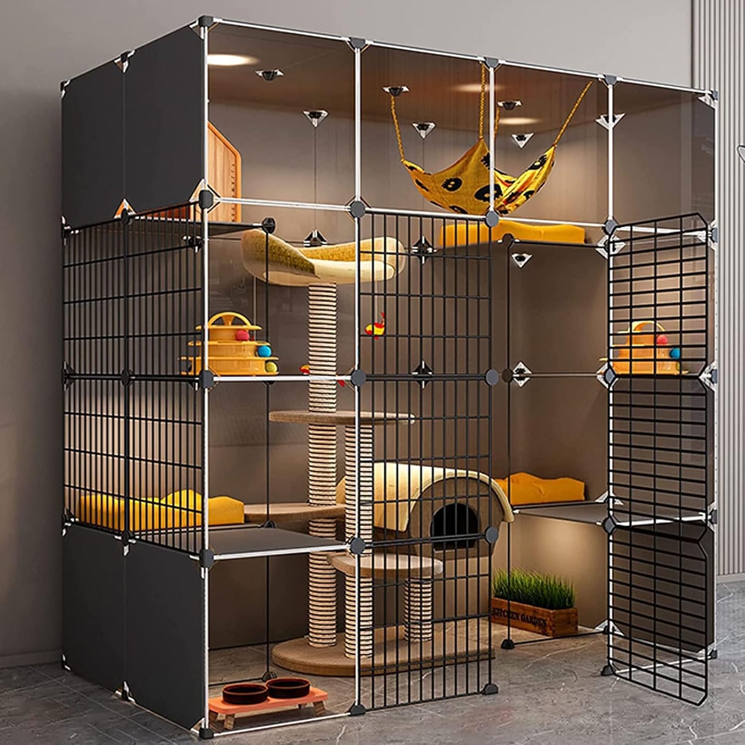 Cattery specifications Name: DIY cat cage / Pet fence / Pet playpen / Cat enclosure / Cat crate / Cat house / Cat cage villa / Cat apartment cage / Cattery Material: Metal, ABS plastic Size: (The size is as shown in the picture) 111*39*111cm , 111*75*111cm , 111*75*147cm , 147*39*111cm , 147*39*147cm , 147*75*111cm , 147*75*147cm , 147*111*147cm , 147*111*182cm , 147*147*147cm , 179*75*182cm , 219*75*182cm Assembly Required: Yes Package A: reinforcement buckle, cable tie Package B: reinforcement buckle, tie, cat nest, cat hammock, climbing ladder Package C: reinforcement buckle, cable tie, cat nest, cat hammock, climbing ladder, cat litter box, cat litter shovel Package D: reinforcement buckle, cable tie, cat nest, cat hammock, climbing ladder, cat litter box, cat litter shovel, cat bowl Advantages: 1. Owning a cat can kill boredom time and eliminate personal loneliness and isolation. Really can be an emotional and spiritual support. 2. Owning a cat does not require too much effort and is very worry-free. 3. Cats do not have the bad habit of breaking up homes. 4. Cats eat less, are less likely to get sick, and are cheaper to keep. Note: This product includes only one cage in the picture, other accessories in the cage are not included. If you need other accessories, you need to buy the package, there are 4 kinds of packages A, B, C, and D to choose from. Packing list: Cat cage *1 Package A/B/C/D *1 Service