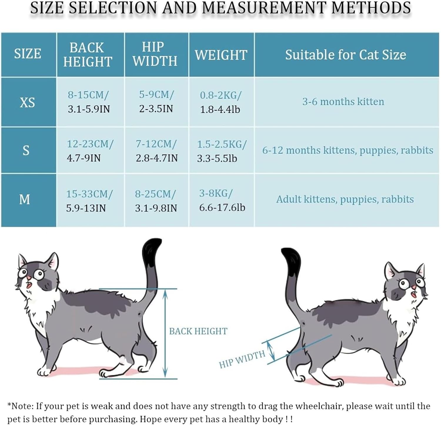 Features:Our cat wheelchairs are tailored to fit cats' hind legs and are suitable for pets with hind paralysis, disability, injury, arthritis, ACL, offering unparalleled support and mobility.The new cat wheelchair comes with a detachable cat harness. When your cat is not utilizing the wheelchair, you can effortlessly remove the wheelchair and use it as a regular cat harness or wash it.The small dog wheelchair has an adjustable frame that effortlessly adjusts the height, width, and length to guarantee your pet's comfort.Our cat wheelchair for back legs is constructed from aviation aluminum, and its lightweight design and durable build ensure your pet can move around comfortably.Cat wheelchairs are available in various sizes for cats, puppies, and rabbits.Assembling and using our cat wheelchairs is an easy process that comes with straightforward step-by-step instructions included in the package.Specifications:Name: Cat WheelchairColor: As pictured:Material: Aviation AluminumSize: XS, S, M (please select the size using the size table)Packing List:1 * Cat wheelchair (please select the size according to the size table)Note:* If your pet has no strength to drag the wheelchair, please wait until they recover before making a purchase.* Please measure your pet before purchasing.* A 2-wheeled pet wheelchair suited for pets with normal forelimbs and aging hind limbs, paralysis or injury.* It is recommended to wear or exercise for 2-5 hours a day, (depending on your pets physical condition).