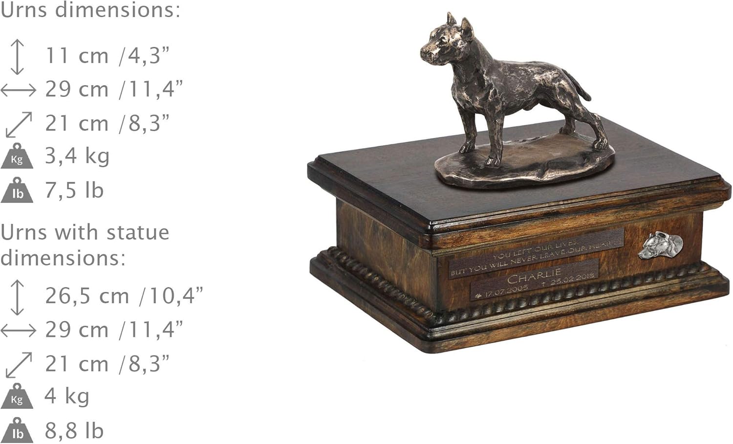Handmade with precision and care, this cremation box combines artistry with functionality to create a unique and lasting tribute. The Cold Cast Bronze Dog statue, intricately detailed, becomes a focal point of this urn, capturing the spirit and essence of your furry companion. Crafted from durable birch wood, the urn makes for a secure and enduring final resting place. The wooden material adds a touch of warmth and natural beauty, making it a fitting tribute to your pet's memory. Customization is at the core of our Art-Dog Collection, offering a diverse range of statues representing any breed. This allows you to create a personalized memorial that truly reflects the unique qualities of your beloved pet. The wreath-shaped decorations further enhance the urn's aesthetic appeal, adding a subtle yet elegant charm to the overall design. Practicality meets style with the convenient removable lid, ensuring an easy and respectful process for placing your pet's ashes. The urn's dimensions, measuring 21 x 29 x 11 cm, strike a balance between ample space for ashes and a compact size that fits seamlessly into your home. More than just a container, this exclusive Dog Urn by Art-Dog is a meaningful work of art, radiating style and elegance. It stands as a testament to the enduring love and companionship you shared with your pet, creating a memorial that will forever honor their memory.