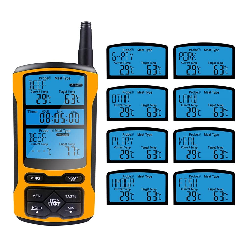This is a food thermometer with probes, which can independently display the temperature of two different probes.The type of meat and the maturity of the meat can be selected independently.The LCD backlight color can change according to temperature.Alarm when the temperature reaches the set temperatureLCD backlight, press any key to light up the screen for 10 secondsSpecification:The transmitter unit uses 2 AAA batteries (not included)The receiver unit uses 3 AAA batteries (not included)Temperature measurement range: -10C- -300'C (14F ~572F), below 14F displays "LLL", above 572F displays "HHH"Receiving distance: 100 feet (30 meters)Cooking operations:Press the C/F button to select the preferred temperature unit.Among the flashing symbols, press the MEAT button to select the type of meat you are cooking, and each press of the MEAT button will cycle through the selection:Beef-Veal-Lamb-Pork-Fish-Poultry (PLTRY)-Poultry (G-PTY)-Hamburger (HMBGR)-OtherPress the TASTE button to select the cookedness of the meat you want, and each time you press the TASTE button, the selection will be cycled:Well done-medium good-medium-medium rare-rareThe color-changing LCD shows the progress of your main course:<;MEDIUM RARE<;1 medium<;MEDIUM WELL<;goodRed: WELL DONE ≤ current temperatureNote:Due to the different monitor and light effect, the actual color of the item might be slightly different from the color showed on the pictures. Thank you!Please allow 1-2cm measuring deviation due to manual measurement.Quantity : 1 pcs