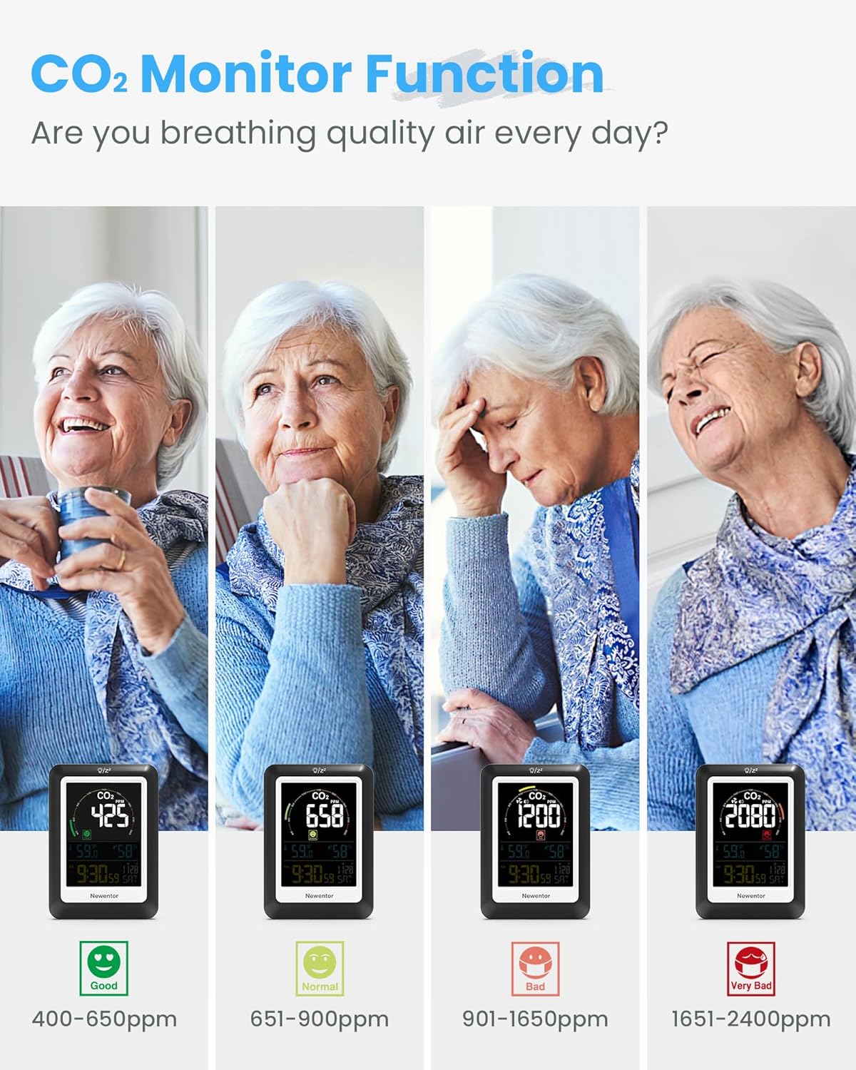Newentor Q5 Weather Station: A weather station with 3 sensors, powered by batteries (batteries not included), and featuring an atomic clock function. Newentor C1 CO2 Detector: Equipped with a high-precision carbon dioxide detector with Swiss Sensirion chip, it is the ideal choice for monitoring home air quality.