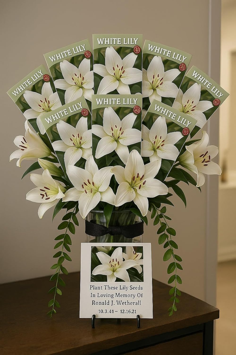 Ready-to-Use Memorial Display – This fully assembled White Lily seed packet bouquet arrives complete with vase, greenery, ribbon, and memorial card, making it perfect for funeral tables, memory corners, or celebration of life events. Includes 8–10 Lily Seed Packets – Each bouquet contains multiple White Lily seed packets displayed beautifully in a floral-style arrangement. Guests can take a packet as a meaningful remembrance gift. Symbolic & Comforting Tribute – White Lilies represent peace, purity, and everlasting love. Planting these seeds creates a living tribute that blooms year after year in memory of a loved one. Thoughtful Guest Favors – Seed packets offer guests a lasting way to remember someone special. They make heartfelt funeral favors, memorial service keepsakes, and sympathy gifts. Elegant Presentation – Includes decorative vase, greenery accents, black ribbon tie, and a printed “Plant These Lily Seeds in Loving Memory” display sign. No assembly required.