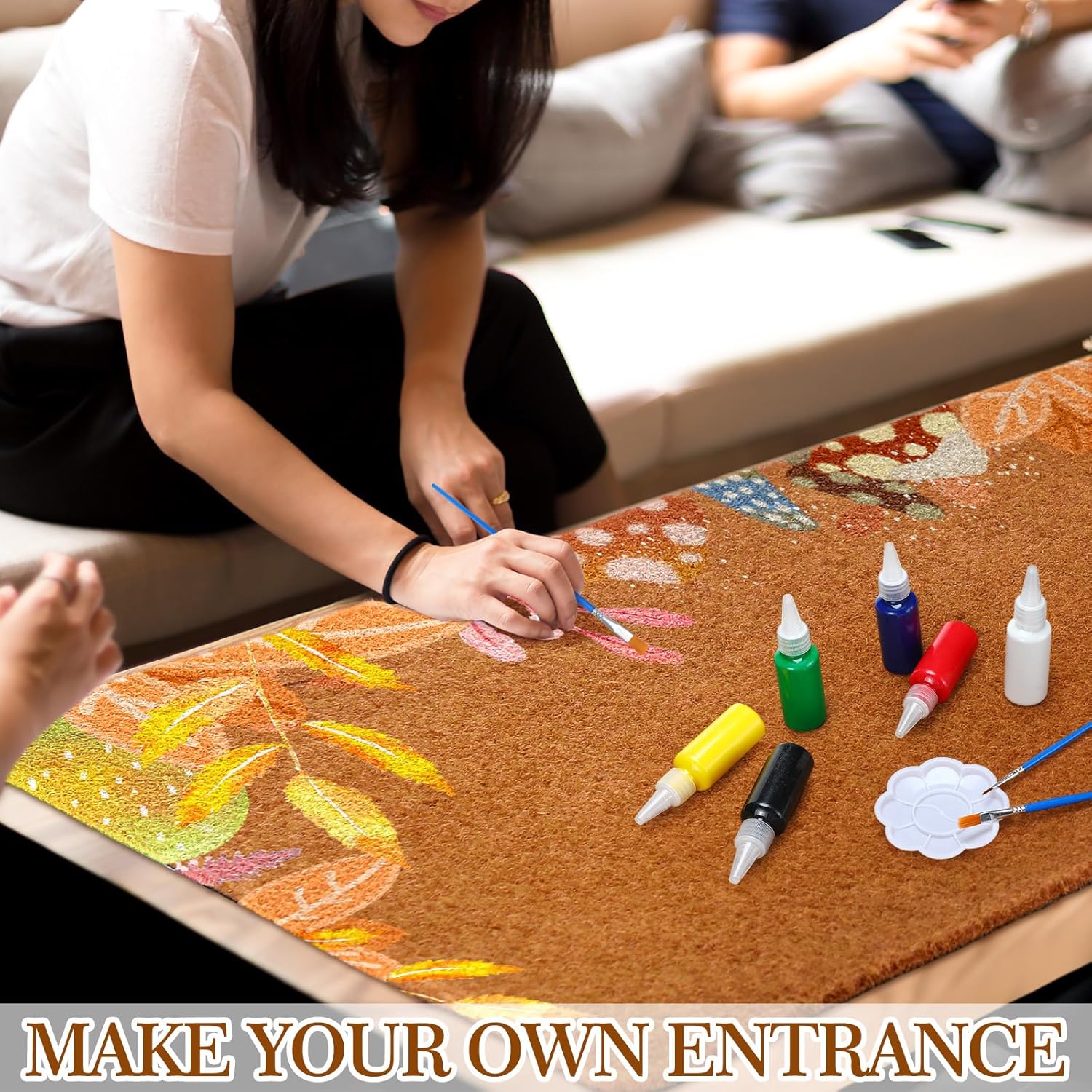 Features: Widely application: These plain doormats are not only limited to home use. They're a great addition to offices, stores, or many other business establishments. It's a brilliant way to welcome visitors while keeping the indoor space clean. Breeze to clean: Cleaning is a breeze with our coir doormat, just shaking or sweeping can easily remove the dirt and debris. It's an easy maintenance accessory that provides both functionality and style to your doorstep. Specifications: Material: coir Color: blank Size: about 17 inches x 30 inches in width and length Package includes: 4 x Doormats 12 x Bottles of acrylic paint 8 x Brushes 4 x Color palettes Notes: Manual measurement, please allow slight errors on size. The color may exist a slight difference due to different screen displays