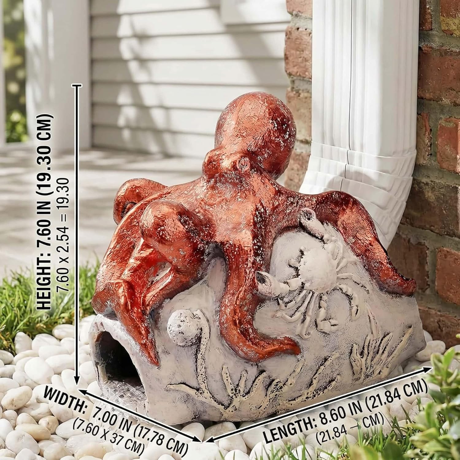 Euiroet's Real Octopus Sculpture Gutter Downspout Extender is the perfect blend of functionality and charm for your garden. As a decorative yet practical solution, it serves as an excellent Gutter Diverter Rain, guiding water away from your home's foundation while adding a touch of whimsy. Made from eco-friendly resin, this downspout extension is not only durable but also a sustainable choice. The hand-painted details and weather-resistant finish ensure that it remains vibrant and beautiful through all seasons. Whether you're looking to enhance your garden's aesthetics or searching for a unique gift, this Decorative Gutter Extension Downspout is a delightful addition. It fits rectangular downspouts up to 3"x 4", making it easy to install and integrate into your existing setup. Elevate your outdoor space with this charming and functional Gutter Downspout Decoration, and enjoy a splash of fun and elegance in your garden. This Splash Block and gutter downspout extensions are designed to be both practical and visually appealing, ensuring that your rain gutter downspout extension not only functions well but also adds a unique style to your home. With its compatibility and durability, this downspout diverter is a must-have for any homeowner looking to add a bit of personality to their outdoor living space.