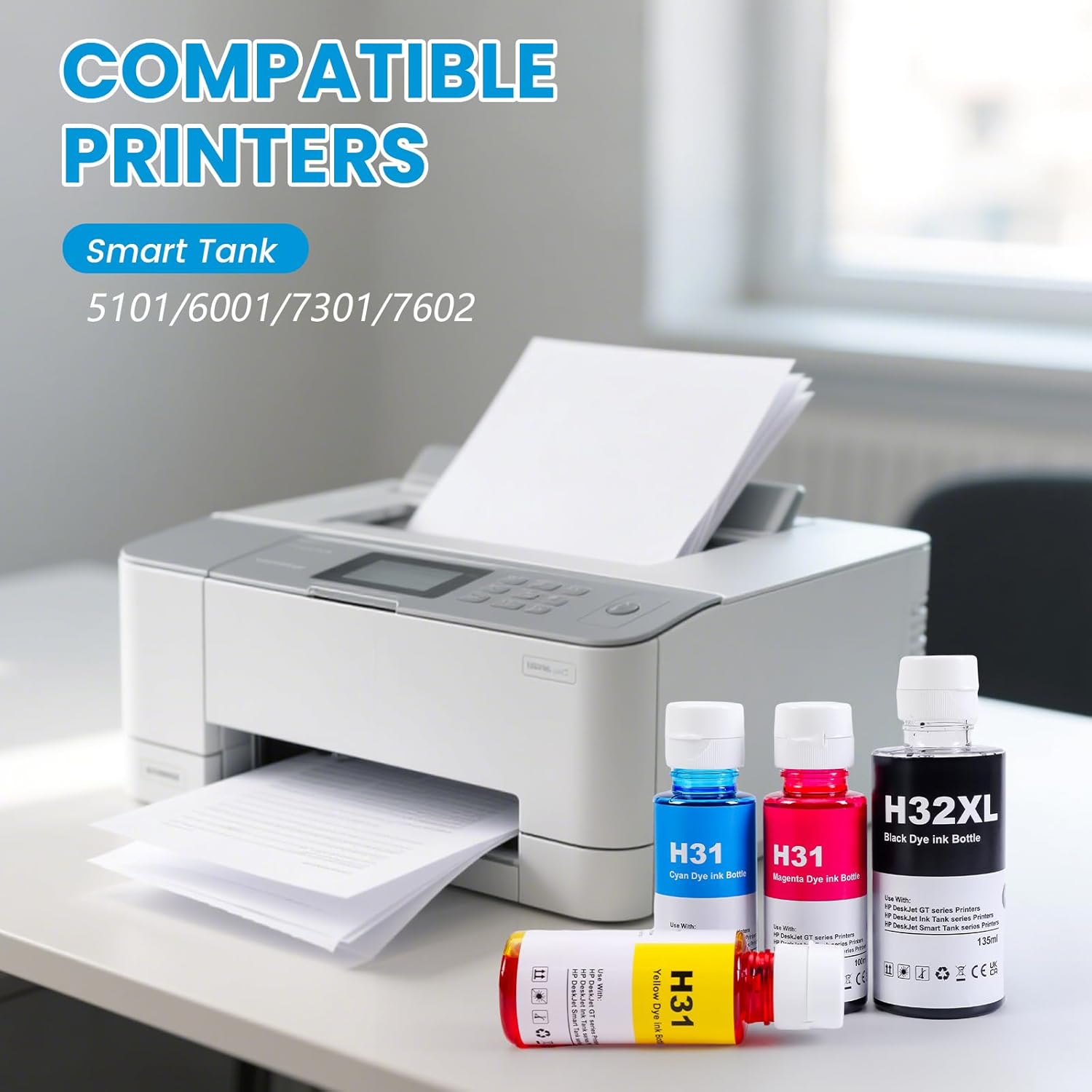 • Broad Printer Compatibility:This ink bottle set is a compatible replacement for 31 (color) and 32XL (black) ink bottles. It works with a wide range of Smart Tank printers including 5000, 5101, 6001, 7001, 7301, 7602 series; Smart Tank Plus 551, 555, 557, 559, 651, 655 series; and Ink Tank 310, 410, 415, 416, 418, 419 models.